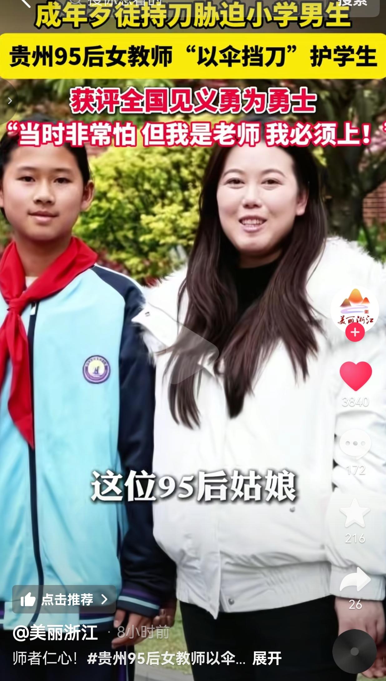 破防了!这才是真正的师者仁心,是刻在骨子里的勇敢与善良! 2025年11月20日早上7点50分,贵州贵阳花溪区,杨家慧老师像往常一样骑车去学校上班。路过小区拐角,突然听到一声撕心裂肺的呼救! 她赶紧掉头冲回去——眼前一幕差点吓懵:一名女子正拿着菜刀,疯狂砍向一个十一二岁的男孩! 换作任何人,看见明晃晃的菜刀对着孩子,第一反应都是害怕、躲闪、赶紧跑。可杨老师没有半秒犹豫,立刻冲上去!她手边啥都没有,只有一把掉在地上的雨伞! 她攥紧那把伞,用自己瘦小的身子死死挡在孩子前面,拼命推阻持刀歹徒,硬生生用一把伞,挡住了砍向孩子的刀! 后来有路人刘明贵也冲上来帮忙,一起控制住歹徒。杨老师顾不上喘口气,马上打120、报警,蹲在孩子身边轻声安抚,一直守到救护车和警察来! 事后有人问她害不害怕,杨老师红着眼眶说:“说实话,当时非常怕,看到刀的时候腿都在抖!但我是老师,我必须上!我不能眼睁睁看着孩子出事!” 就这一句话,直接给我整破防了!她不是不怕死,不是不害怕,她只是在危险面前,把“老师”这两个字刻进了骨子里,把孩子的命看得比自己的命还重! 她救下的,不是自己的学生,只是一个素不相识的陌生孩子!可在她眼里,只要是孩子,就必须护着!这才是真正的为人师表,是刻在骨子里的责任感!这位95后姑娘,用行动诠释了什么是“师者仁心”,什么是为人师表! 网友评论区直接炸锅,全是破防的声音,有的网友说:“这才是老师!不是那种只会教书本的,是真正把学生当孩子的!杨老师太勇敢了,给你磕一个!” 也有的网友说:“我家孩子也上小学,看完直接泪目!要是我家孩子遇到这种事,能遇到杨老师这样的老师,我这辈子都感恩戴德!” 还有的网友说:“太帅了!以伞挡刀,这是什么神仙老师!换我我可能都不敢上前,杨老师是真的英雄!” 也有的网友说:“获评全国见义勇为勇士实至名归!杨老师用行动诠释了什么是见义勇为,什么是师者仁心!” 说实话,我看完这个事,心里又暖又酸。 暖的是,在这个人人都怕惹麻烦的时代,还有人能不顾自身安危,冲上去救一个陌生孩子;酸的是,我们总说老师是园丁,可真正能做到用命护学生的,才是真正的灵魂工程师! 杨老师不是超人,她只是一个普通的95后女孩,她也会害怕,也会发抖。可在孩子面临生命危险的那一刻,她把恐惧压在心底,把责任扛在肩上,用一把伞,撑起了一个孩子的生的希望! 这就是老师!不是站在讲台上的光鲜亮丽,而是在危险来临时,永远挡在学生身前的那道墙! 她用行动告诉我们,什么是“学高为师,身正为范”,什么是“师者仁心,大爱无疆”! 今年3月,杨家慧老师荣获中央政法委全国见义勇为勇士称号,这份荣誉,她当之无愧!为她点赞! 最后我想说的是:我们总在吐槽老师,总在挑剔教育,可总有人在用生命践行着“老师”这两个字的重量。 杨家慧老师,谢谢你!谢谢你用一把伞,护住了一个孩子的未来,也护住了我们所有人对老师的敬意! 最后,希望每一个孩子都能被温柔守护,愿每一份勇敢都能被看见、被嘉奖!