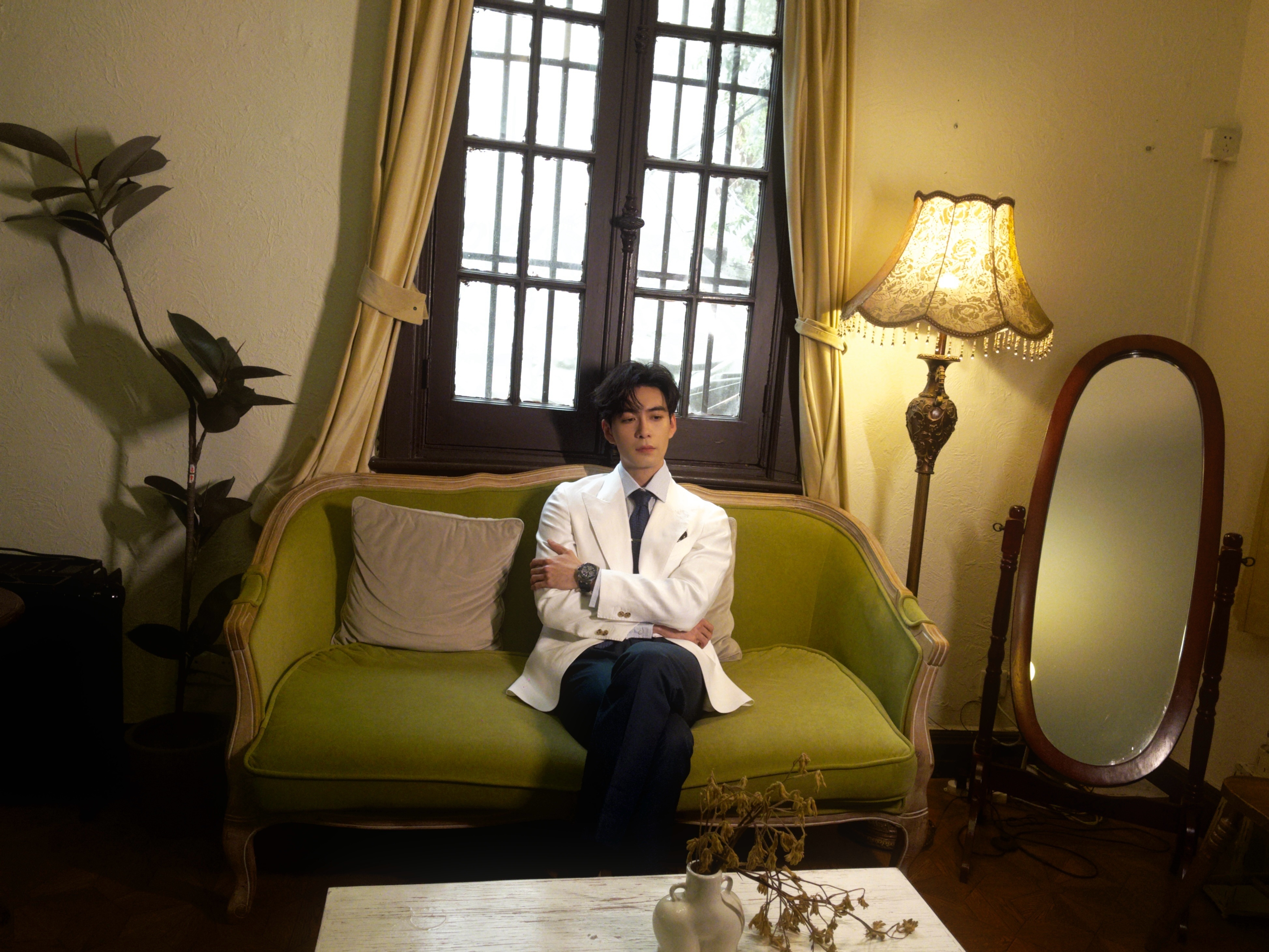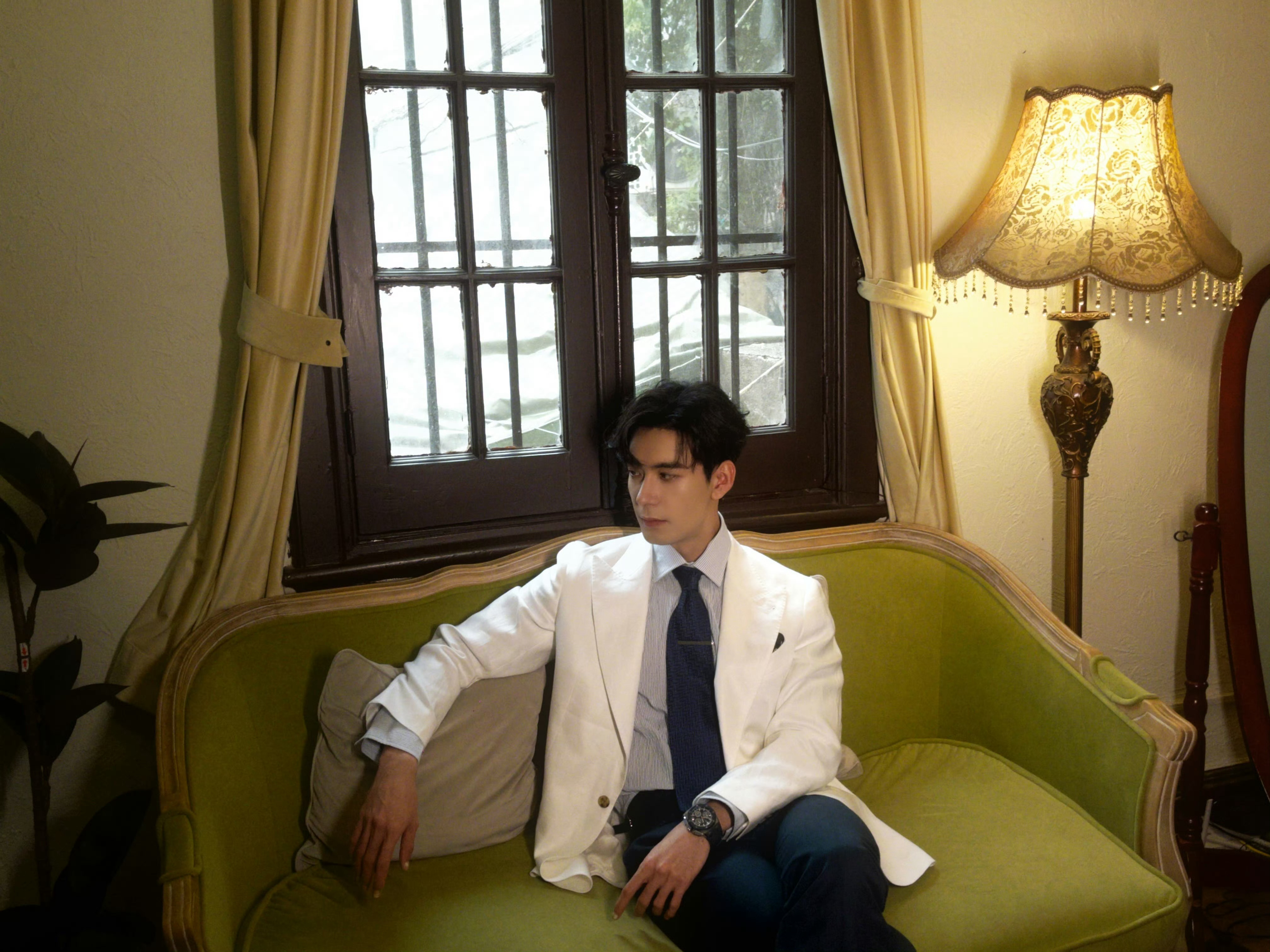 他慵懒的陷在沙发里,长腿随意舒展,双臂敞开搭在沙发靠背上,整个人放松得像卸下所有疲惫。侧脸线条利落干净,下颌线清晰分明,睫毛垂落投下浅影,领口盖的住性感的锁骨却藏不住凸起的喉结。小憩片刻,漫不经心,深深陷落。