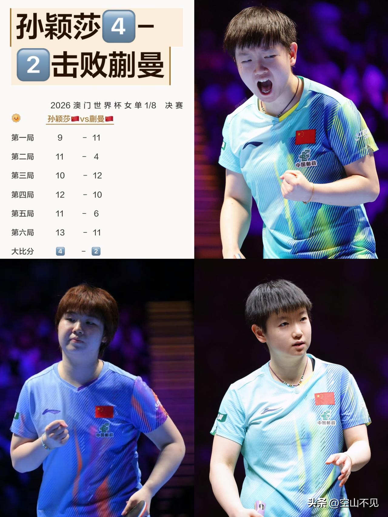 澳门世界杯 孙颖莎4-2蒯曼,晋级8强。 众所周知內战最难打,两人既是队友也是师出同门,熟得不能在熟了,一个眼神就能猜到下一个动作。双方斗智斗勇,比战术比技术比心态,蒯曼拼劲十足,莎莎解题能力强更胜一筹。 莎莎再一次战胜自己,面对全世界所有强敌的挑战,还能保持战绩,真的很棒👍🏻
