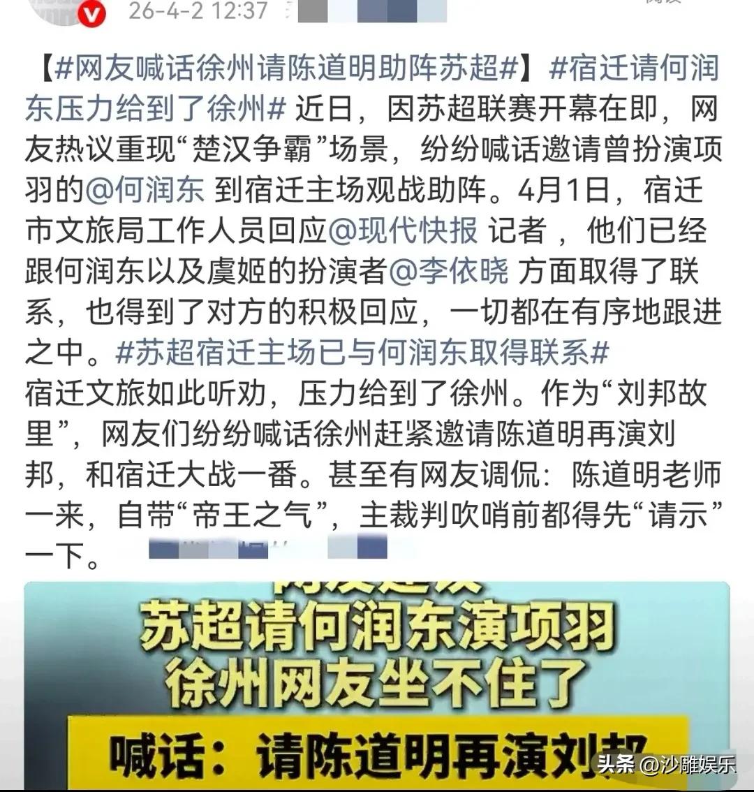 陈道明,突然冲上热搜! 4月2日,一向低调到快“人间蒸发”的陈道明,竟然以一种让人啼笑皆非的方式登上了热搜。而点燃这一切的导火索,竟然是一场还没开踢的苏超联赛。 事情的起因是这样的,眼看苏超联赛马上要开幕了,网友们的脑洞直接开到了大气层外。有“课代表”带头提出:宿迁可是西楚霸王项羽的老家,正好何润东当年演的项羽被赞为“铁血霸王”又翻红了, 还不赶紧让宿迁文旅把“项羽”请回来压阵?更绝的是,宿迁文旅那叫一个“听劝”,立马拍板说已经跟何润东和李依晓都联系上了,正有序推进呢! 这下,宿迁把“氛围组”安排得明明白白,压力可就直接给到了“刘邦故里”徐州。网友们又纷纷看热闹不嫌事大,齐刷刷喊话徐州文旅:赶紧把“刘邦”陈道明请出来啊,得跟宿迁来一场实打实的“楚汉争霸”啊! 但说到亮点,还是网友们的脑补最精彩。 大家纷纷调侃:“陈道明老师要是来了,自带帝王之气,主裁判吹哨前都得先请示一下!”“到时候陈道明往主席台一坐,场上球员谁还敢不拼命?”这画面感,简直绝了! 更有“端水大师”出来支招:“别光徐州和宿迁打啊,淮安赶紧把段奕宏请来演韩信,韩信点兵,多多益善,直接让苏超变楚汉全明星!” 不得不说,这一届的“散装江苏”网友,玩梗的天赋是真的拉满了。 不过话说回来,咱们冷静分析一下:梦很丰满,但现实恐怕很骨感。请陈道明?那难度可不是一般的大。 首先,陈道明如今已经70岁了,作为中国电影家协会主席,他现在对自己的公开活动几乎到了苛刻的程度。而且他活得太通透了,不抽烟不喝酒不喜应酬,出门骑单车、在家读书写字,低调得像个“扫地僧”。 让他为了文旅商演去球场上“溜达一圈”,除非剧本里写的这球必须赢,否则以他的性子,大概率会拒绝。 果不其然,就在同一天,有记者去问徐州文旅有没有邀请计划,相关工作人员的第一回应是:暂时没有。虽然随后又有媒体爆出“相关处室正在谋划”,但这含糊其辞的态度,跟宿迁那边的干脆利落形成了鲜明对比。 在我看来,这次“全网喊话陈道明”虽然大概率只是一场美好的网络狂欢,但它恰恰折射出了苏超联赛的灵魂所在。 正如有媒体评论的那样,苏超的特殊之处,是它不像顶级联赛那样高冷,反而更像一场全省的“城市大联欢”。 当文旅局肯“下场接梗”,当网友的“PPT方案”能被官方采纳,这种从民间生长出来的松弛感,才是咱们最好看的风景。 最后,你们觉得徐州文旅有没有那个魄力,真的去敲陈道明老师的门吗?
