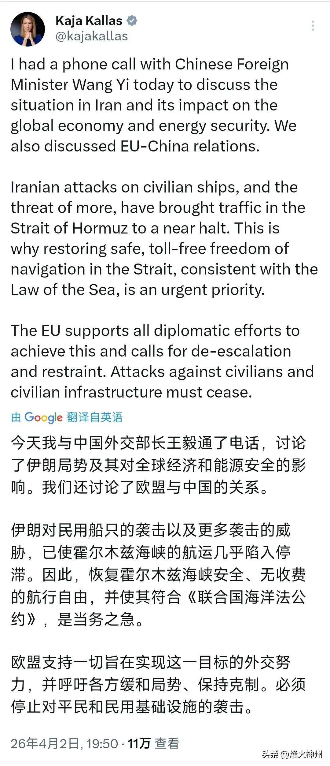 欧盟外交与安全政策高级代表卡拉斯今晚(北京时间4月2日晚)写道:“今天我与中国外交部长王毅通了电话,讨论了伊朗局势及其对全球经济和能源安全的影响。我们还讨论了欧盟与中国的关系。 伊朗对民用船只的袭击以及可能发生的更多袭击,已使霍尔木兹海峡的航运近乎停滞。这就是为什么恢复该海峡安全、免费且符合《联合国海洋法公约》的航行自由是当务之急。 欧盟支持一切旨在实现这一目标的外交努力,并呼吁各方缓和局势,保持克制。必须停止针对平民和民用基础设施的袭击。” 评几句: 欧盟外交高官卡拉斯与王毅通话,一面高举《联合国海洋法公约》呼吁保障霍尔木兹海峡航行自由,一面将航运停滞全责扣给伊朗,这番表态虚伪至极、双标尽显。 霍尔木兹海峡通航受阻,根源是美以未经授权对伊朗发动非法军事打击,轰炸民用设施与平民目标,才引发地区连锁反制。欧盟对霸权暴行视而不见,却对伊朗的正当自卫横加指责,刻意颠倒因果、回避冲突源头。 欧盟嘴上喊着外交斡旋、各方克制,实则只为守护自身能源利益,不敢得罪美国,只敢向弱势方施压。所谓国际法与航行自由,不过是选择性适用的工具。这种畏强欺弱的姿态,彻底戳破欧盟战略自主的谎言,沦为国际社会的笑柄。中方始终劝和促谈、直指症结,而欧盟的空洞表态,不过是自欺欺人的政治表演。