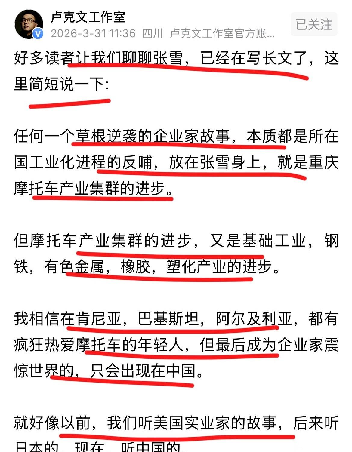 一个叫张雪的女孩,骑着摩托车火遍了全世界。 很多人都说,这姑娘是靠热爱、靠一股子野劲儿闯出来的。但有个问题没人想过:为什么别的国家有那么多爱摩托的年轻人,却只有一个张雪,出在了中国? 镜头拉开,别光盯着她。 看看她身后的重庆。一座巨大的工厂之城,齿轮咬着齿轮在转。滚烫的钢水被浇筑成车架,刺鼻的橡胶被压制成轮胎,无数个叫不上名字的精密零件,从上万个车间里像血液一样涌出来,汇集到她手上。 她一拧油门,背后是整个国家工业体系在轰鸣。 这不是一个人在玩车。 很多人翻出她19岁时的纪录片,一个小姑娘,满手油污,蹲在角落里对着一个报废零件琢磨半天,眼神里那股劲儿,藏不住。 但光有这股劲儿还不够。 是那些能把任何图纸变成现实的工厂,是那些能以“白菜价”供应任何零件的市场,是这条完整到可怕的产业链,把她的热爱和天赋,直接“兑现”了。 所以说,这根本不是什么个人逆袭的神话。 这更像一个信号。当一个国家的工业底子厚到一定程度,普通人的梦想,就真的能插上翅膀。你只管往前冲,背后有一整个“巨兽”给你托着底。