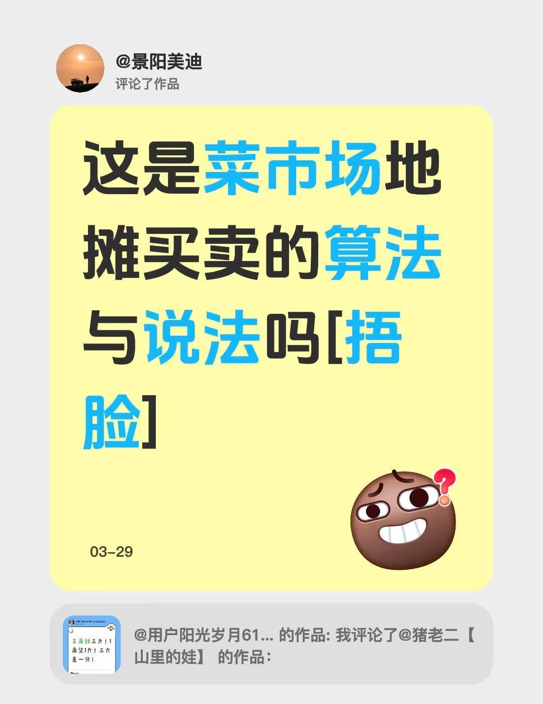 我评论了@用户阳光岁月613790902855 的作品:这是菜市场地摊买卖的算法与说法吗[捂脸]