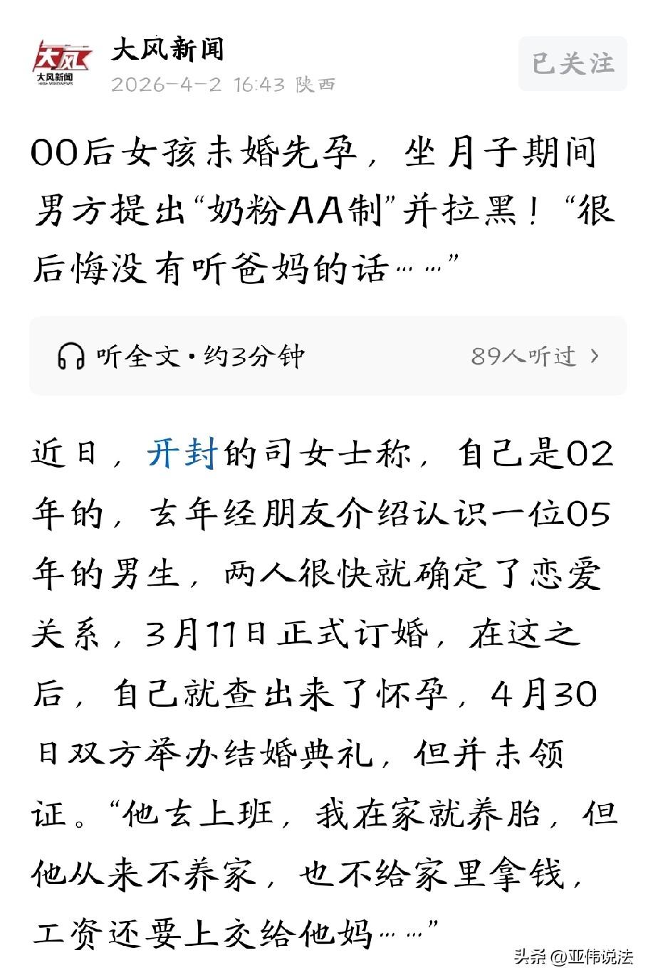 活不起了?河南开封,00后女孩不听父母劝阻,执意要和男子结婚,甚至还未婚先孕。婚后女孩在家保胎,男子却不承担家庭责任,生孩子住院的费用要女孩自己承担,坐月子期间更是提出奶粉AA制。更过分的是,男子还拿走孩子的疫苗本,拉黑女孩,玩起了消失。记者联系上男子一家,询问奶粉AA制的原因,原来是因为20万的彩礼。 据悉,02年的女孩司女士正是花一般的年纪,青春懵懂的她,对爱情满是憧憬。 去年通过朋友介绍,司女士认识了一位05年的男生,两人刚接触没多久,就互生好感,迅速确定了恋爱关系。 陷入热恋的司女士,完全被感情冲昏了头脑,总觉得女大三抱金砖,她也认准了这份感情。 司女士的父母得知后百般劝阻,觉得两人年纪太小,相处时间也短,担心她遇人不淑,可她压根听不进去,执意要和对方在一起。 恋爱没多久,两人就在2026年3月11日匆匆订了婚,刚刚结完婚,司女士就发现她怀孕了。 这让她更是认定了要和男方过一辈子,4月30日,两人奉子成婚,举办了简单的结婚典礼,只是一直没有去民政局领证。 办过婚礼后,司女士因为怀有身孕,便安心在家保胎,期待着孩子的出生。 司女士满心以为男友会扛起家庭的责任,自己安心养胎就行,可现实却给了她当头一棒。 男友出去上班后,从来不给家里拿一分生活费,工资全都上交给了自己的母亲,家里的开销、两人出门玩乐的花费,全都是司女士自己承担。 甚至两人还因为十几块钱的小事闹矛盾,司女士虽然委屈,却总想着等孩子出生后,男友当上爸爸就会成熟起来,也就一直忍着没计较。 等到孩子出生,司女士本以为日子会变好,没想到糟心事越来越多。 生孩子住院第一天,三千块的费用都是司女士自己掏的,婆家没有一人主动承担。 坐月子期间,男方只给她转了400块钱,之后就再也没管过她们母子俩,连最基本的生活费和营养费都不肯出。 更过分的是,男方家里竟然提出了奶粉AA制的要求,这让司女士和她的母亲都觉得不可思议,天底下哪有当父亲的,连孩子的奶粉钱都要平分的。 司女士的母亲后悔当初没拦住女儿,直言男方家就是想空手套白狼,一分钱不想出就娶媳妇、抱孙子。 更让司女士彻底心寒的是,在她提出让男方承担家庭责任后,男方一家人直接玩起了消失,不仅把她的联系方式全部拉黑,还偷偷拿走了孩子的疫苗本,让她连孩子的疫苗都没法按时打。 司女士想不通,她托付终生的丈夫,竟然是这样一个没有责任感的男子,直到这一刻,她才后悔当初没听爸妈的话,如今落得这般境地。 无奈之下,司女士找来记者求助,想要男方归还疫苗本,并且承担起做父亲的责任,支付孩子的抚养费。 在村干部的帮助下,记者联系上了男方父亲,几经周折,双方才终于见上面。 面对质问,男方辩解道,他的工资并没有全部交给父母,他也留了一部分,也曾给过司女士几百块。 男方父母更是委屈的不行,他们不是不管孩子,而是家里没钱,当初结婚花了近20万彩礼,欠了不少账,所以才提出奶粉AA制,让司女士帮忙分担一些。 至于他儿子给他们的工资,全部用来还债,这都是结婚给彩礼欠下的。 最终经过记者调解,男方同意把孩子的疫苗本归还给了司女士。 但关于孩子后续的抚养费、生活费等抚养问题,双方没能达成一致,只能后续交由法院判决处理。 《民法典》第1071条规定:非婚生子女享有与婚生子女同等的权利,任何组织或者个人不得加以危害和歧视。 不直接抚养非婚生子女的生父或者生母,应当负担未成年子女或者不能独立生活的成年子女的抚养费。 本案中,两人未领证,属于同居关系,孩子是非婚生子女,但依法与婚生子女权利平等。 男方以彩礼负债、奶粉AA为由,拒不承担抚养义务,还拉黑女方、藏匿疫苗本,违反了法定抚养责任。 男方作为生父,必须支付抚养费,不能以任何借口逃避。 至于“奶粉AA”的主张,更是没有法律依据,也违背公序良俗,属于无效约定,司女士完全可以忽视这一要求。 因此,调解失败后,司女士完全可以起诉,要求男方支付抚养费、返还疫苗本并履行相应的抚养责任。