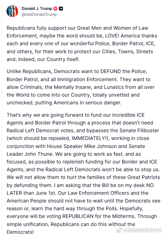 因此,我们将继续推进为我们杰出的ICE特工和边境巡逻队提供资金,这一过程无需激进左翼民主党人的投票,并且绕过了参议院的阻挠议事规则(这项规则应该立即废除!),我们将与众议院议长迈克·约翰逊和参议院多数党领袖约翰·图恩紧密合作。我们将以最快的速度、最专注的行动,为边境和移民执法局(ICE)的执法人员补充资金,激进的左翼民主党人休想阻止我们。我们绝不允许他们通过削减资金来伤害这些伟大爱国者的家庭。我要求这项法案最迟于6月1日送达我的办公桌。我们的执法人员和美国人民不应该等到民主党人幡然醒悟,或者在民调中付出惨痛的代价才有所行动。希望大家都能在中期选举中投票给共和党。只要团结一致,共和党人就能做到这一点,无需民主党人的阻挠!