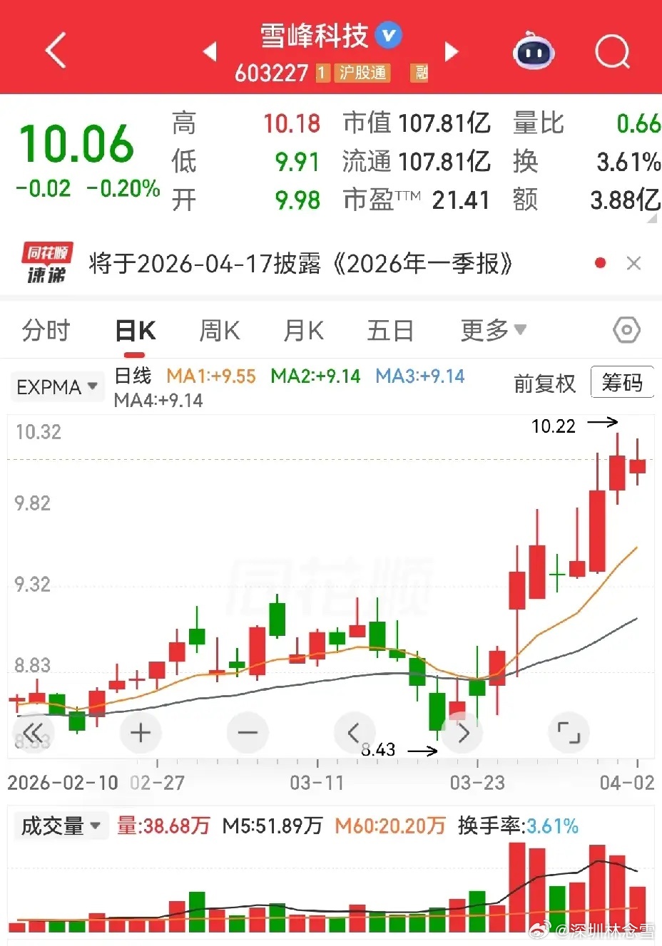 雪峰科技:七阳夹一阴,量能同步放出,昨日缩量整理,抛压明显减轻。