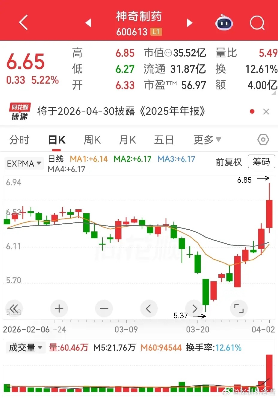 神奇制药:五连阴深跌后逐步修复填平,昨日放量大涨突破平台,走势在逐步转强。