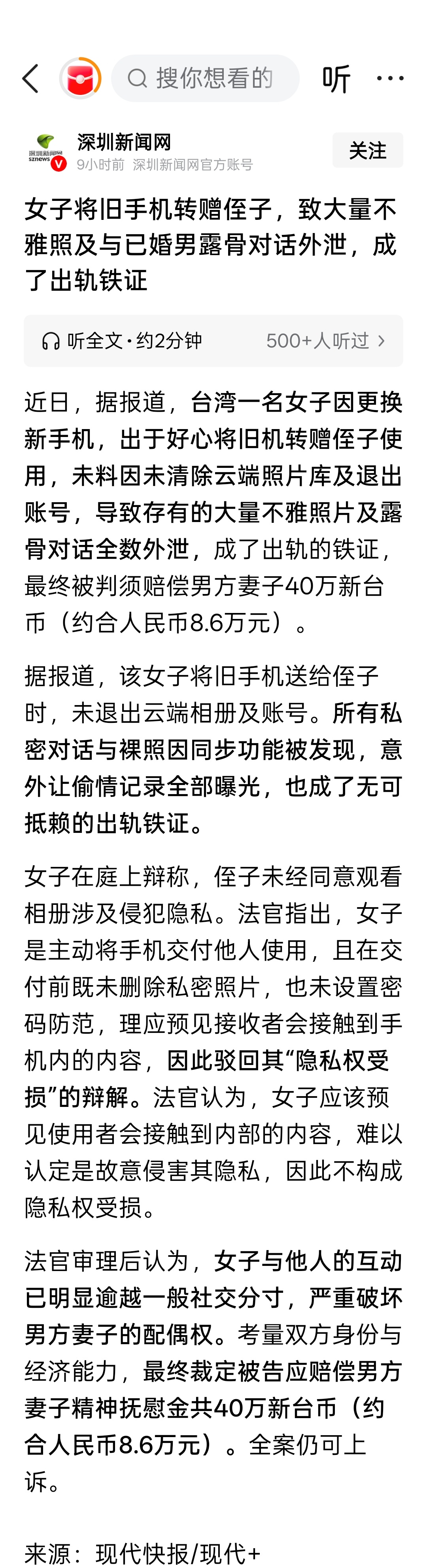 女子将旧手机转赠侄子,致大量不雅照及与已婚男露骨对话外泄,成了出轨铁证