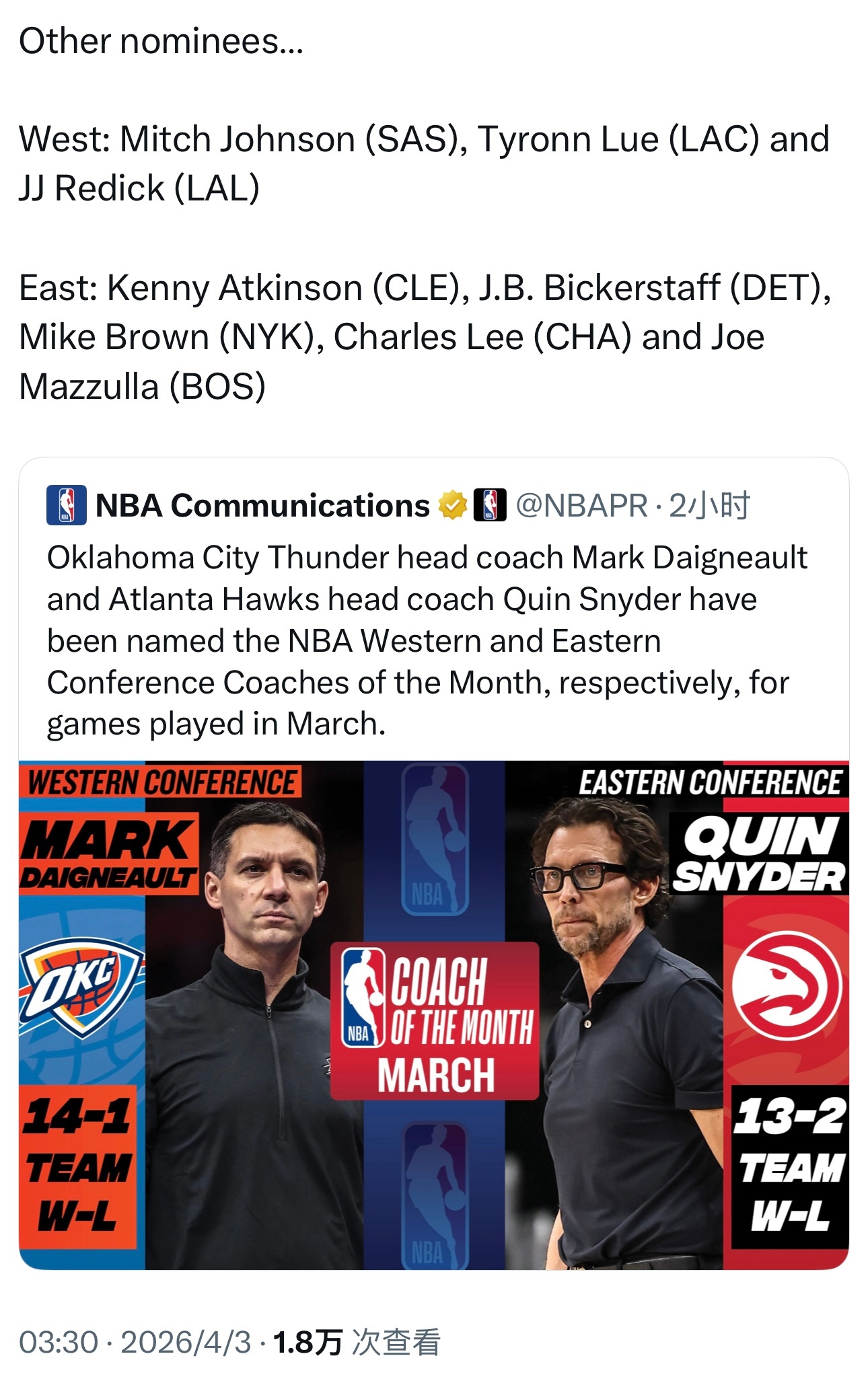 三月东西部最佳教练,戴格诺特与斯奈德当选,雷迪克获得提名!