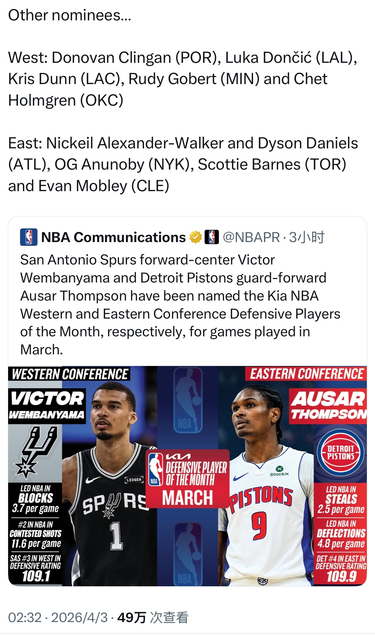 三月东西部最佳防守球员揭晓,文班亚马与奥萨尔·汤普森当选,东契奇获得提名!