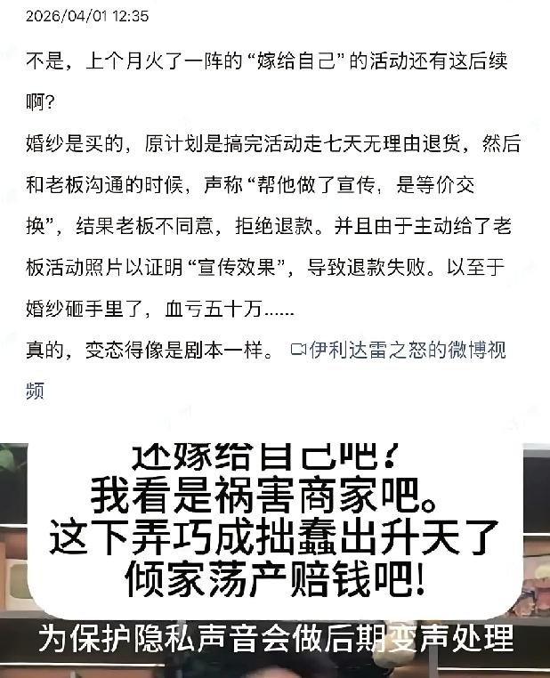 花50多万网购婚纱,举办“嫁给自己”的女网红亏大了,商家竟然不给退货! 真的太离谱了!一位女网红花50多万网购婚纱,办“嫁给自己”的活动,本想活动结束就退货退款,结果直接被商家拒绝,这下彻底栽了! 这位女网红初衷是办活动鼓励女生独立,还想着帮大家省钱,组织一众女生凑钱,由她统一网购70多套婚纱,打算活动结束后走七天无理由退货。她还自作主张在活动现场给商家立广告牌,觉得自己免费打了广告,商家肯定会配合退货。 可万万没想到,活动结束她找商家退货,直接被拒!一边是参与女生都催着退钱,她拿不出钱,另一边商家死活不退,她找律师咨询,还被泼了冷水,起诉胜诉概率极低,毕竟活动视频就是婚纱超出试穿、被实际使用的铁证。 其实这事真不怪商家,女网红完全是想当然,自己单方面觉得免费打了广告,商家就该迁就她,可她压根没提前跟商家沟通退货的事,商家也不知情是批量购买后退货。做事情全凭自己想法,不考虑规则,最后只能自己买单。 说到底,不管初衷多好,都不能无视消费规则,你们觉得这事到底是女网红理亏,还是商家太不近人情?