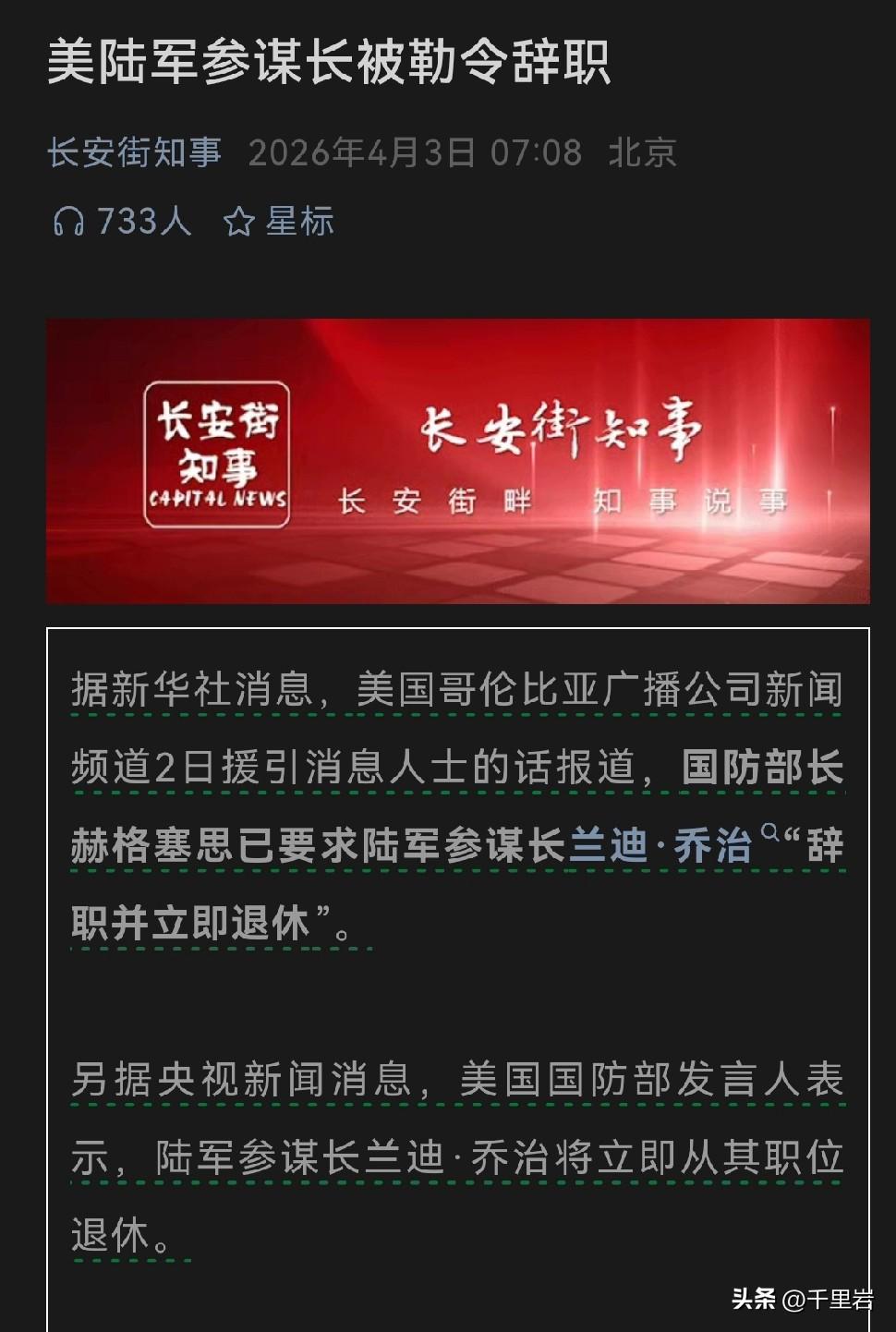 老川普临阵斩将? 看来他是铁了心要打地面战了…… 这个档口上,他把美国陆军最高的军职的军官给斩了,那还能有什么原因? 肯定是从专业军人角度来说这位老兄知道这一仗打不得。 但是这是老川普唯一的脱身借口和救命稻草。至于死多少,美国大兵被炸成什么熊样不重要。 不能让人家落下一个“他说啥胜利了咋一兵一卒都不敢进伊朗了……”这种话柄。 于是事情就成了这样子呗……
