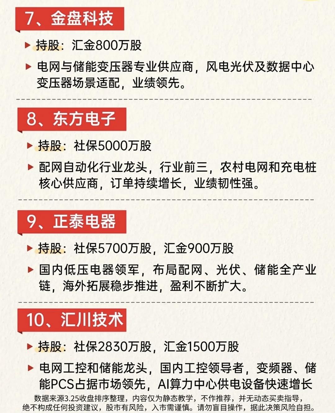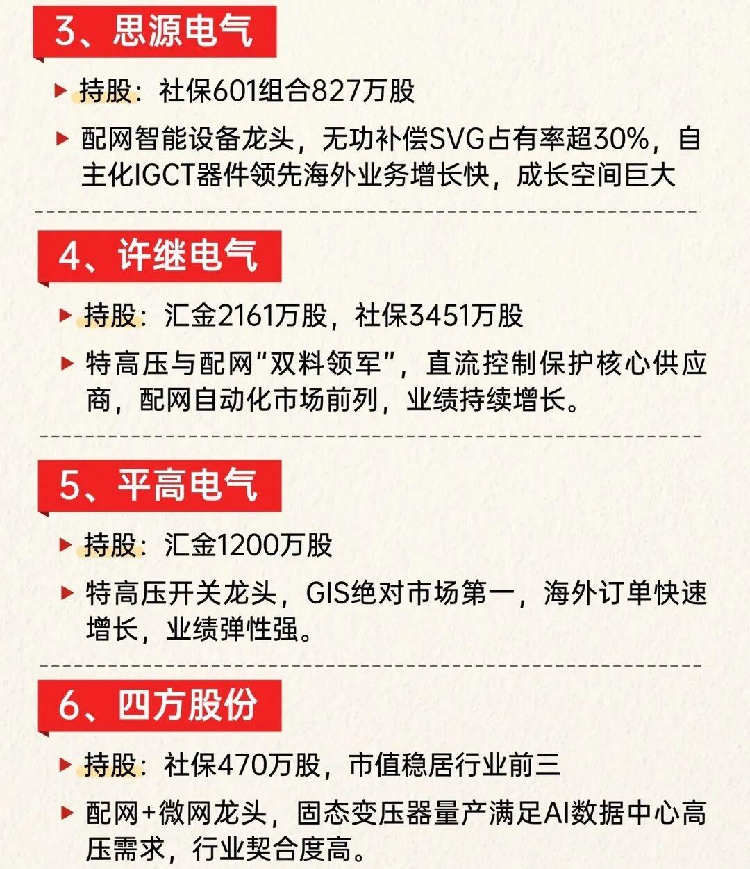 4万亿电网投资砸下来了!国家队重仓的电力设备10大龙头,直接受益特高压开工、配网升级、AI算力中心供电,业绩确定性拉满,赛道景气度持续上行! 国家电网“十五五”4万亿投资落地,2026年电网投资超6000亿,同比增8%以上,特高压、配网智能化、储能成核心投资方向。汇金、社保两大“国家队”重仓布局,电力设备赛道长期投资价值凸显!从特高压龙头国电南瑞、中国西电,到配网智能化龙头思源电气、东方电子,再到储能、工控领军企业汇川技术、正泰电器,10大核心标的覆盖电网全产业链,深度受益4万亿电网投资、特高压新一轮建设、AI算力中心供电等多重利好,是把握电力设备行业景气上行的核心抓手。 ⚠️ 风险提示:本文仅为信息整理,不构成任何投资建议,股市有风险,投资需谨慎。