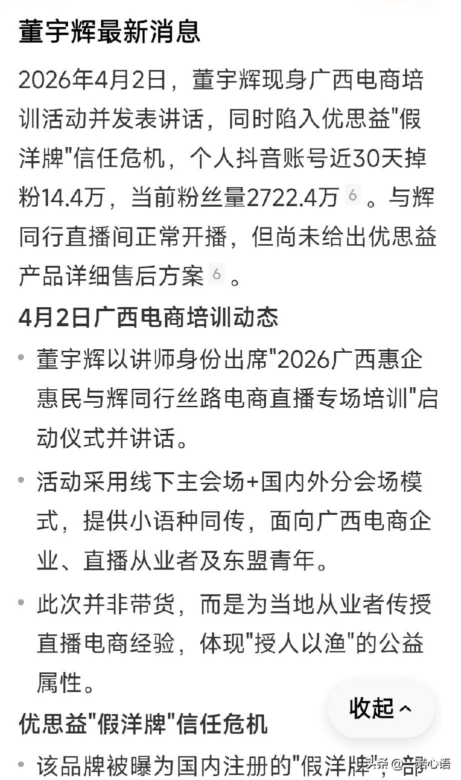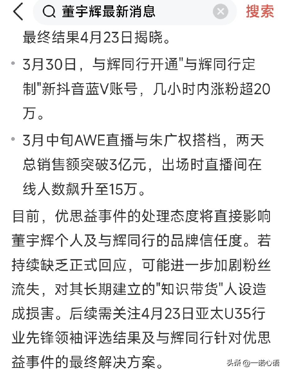 我从来不在与辉同行买货,不是因为董宇辉卖的货不好,而是因为我不喜欢网上购物。 那种看不到实物的不踏实感,让我望而却步。 偶尔,在头条广告中买点零东马西,也都是十块八块的小物件,觉得即使上当,也损失不大。 大物件还是喜欢到实体店买,一是能实地考察物品的品质,二是怕买不到货真价实的东西退货麻烦。 老公也是个老倔货,他买东西更是狭窄,一辈子就那几个店,内衣店一家,休闲装一家,老北京布鞋一家,全身装备就在这几家买。 他说,店主熟悉,他想买啥,店主一搭眼儿,就能拿到他喜欢的货,他需要的尺码,风格,店主烂熟于心,有时他买的东西店里没有,老公就让店主进,想买啥样的,啥颜色的,啥规格,和店主一说,店主马上就给进货,店主要多少钱,就给多少钱。 这么多年都是如此,店主挣钱,我们省心! 董宇辉这次“优思益假洋牌信任危机”,不光给董宇辉敲响了警钟,也给咱消费者敲了警钟,消费不要过度迷信,买东西一定要擦亮眼睛,不要为情怀买单,只买对的,不买贵的。 现在的网店鱼龙混杂,很难挑选,′我的观点就是就近,就熟,就品质。 也就是:“买东西就在自己附近的,熟悉的,质量好的”地方买。 买着方便,用着放心,不合适调换也方便,没有后顾之忧。 老公说:“如果,全中国人,都像咱俩人儿这种消费观念,实体店就火了,店铺就不愁销售了。” 他还说:普通人就为需要买单,为情怀买单咱不够身份。 我说,拉倒吧,你就是网上买货心没底,整不明白,别在这瞎说了。