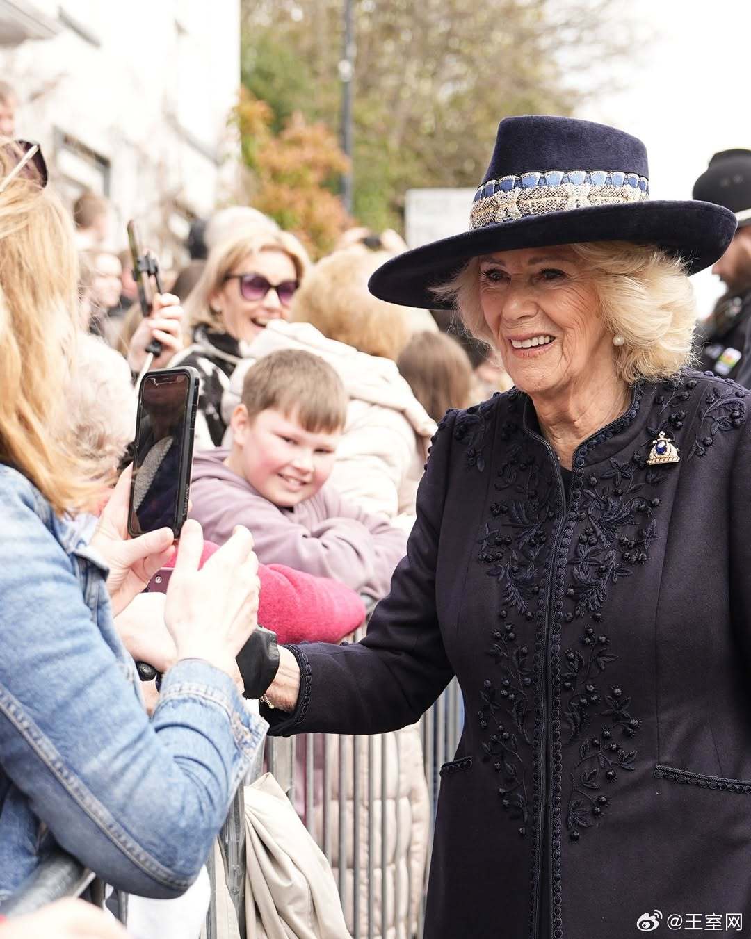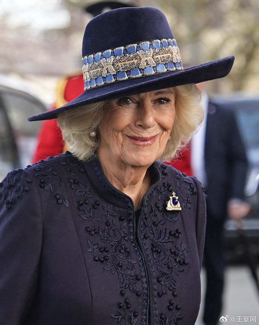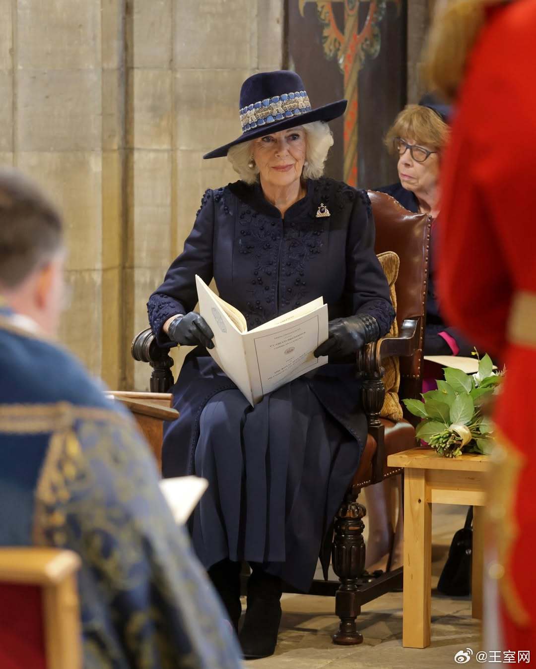 王后佩戴Philip Treacy 的帽子、Christian Dior 订制外套和手提包。