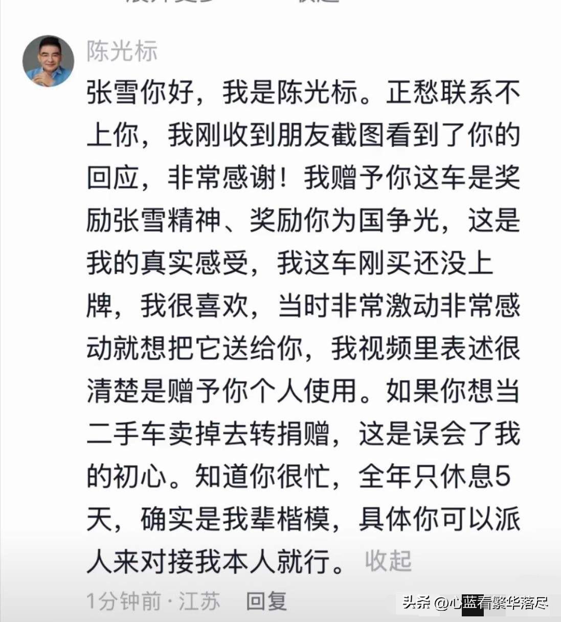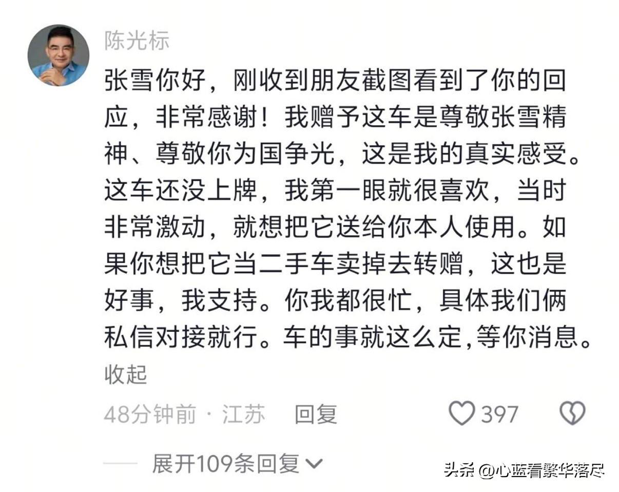 通过以下几点大家就能明白,陈光标到底是不是真心打算送张雪劳斯莱斯了! 第一:陈光标说是为了表彰张雪为国争光,做出贡献,这才送给张雪一辆劳斯莱斯的,可为什么陈光标不直接买几台张雪机车,来实实在在的支持一下张雪呢? 第二:得知张雪要将陈光标送的劳斯莱斯当二手车给卖掉,然后把卖车的钱全部捐给嫣然天使,这时候陈光标又改口说,该车只是赠予张雪使用,如果张雪拿去卖掉或转赠,就是误会了他的初心,言下之意就是张雪要是打算卖掉劳斯莱斯的话,那他就不准备送了! 第三:陈光标送张雪劳斯莱斯这事,在引起网友们的热议后,陈光标又改口说张雪要是把劳斯莱斯当二手车卖掉或转赠,他也是支持的,不过具体情况的话,需要张雪去主动联系他!那么请问这到底是陈光标送张雪劳斯莱斯呢,还是让张雪找陈光标要劳斯莱斯呢? 那么现在大家认为陈光标,到底是不是真心打算送张雪劳斯莱斯呢?