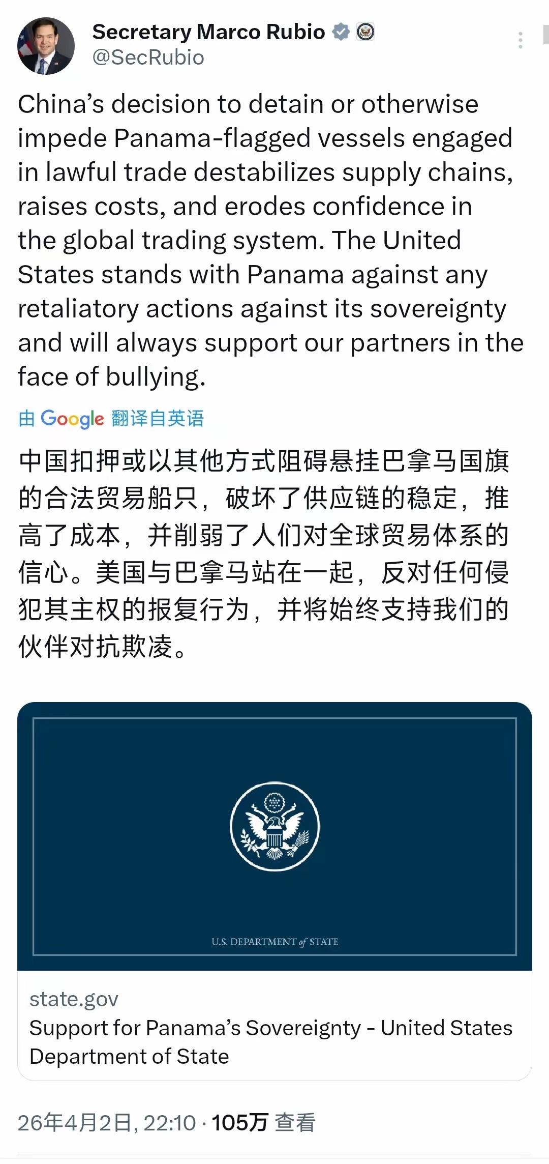 2日,美国政客鲁比奥发文指责中国,称:“中国扣押或以其他手段阻碍悬挂巴拿马国旗的合法贸易船只,破坏了供应链稳定,抬高了成本,还削弱了人们对全球贸易体系的信心。美国会和巴拿马站在一起,反对任何侵犯其主权的报复行径,且将一直支持我们的伙伴对抗所谓‘欺凌’。” 然而,鲁比奥这番言论纯属颠倒黑白的恶意抹黑。美国向来热衷“贼喊捉贼”,自己动辄制裁、威胁他国,破坏供应链与秩序,却给中国扣莫须有罪名。其打着“支持伙伴”“维护主权”幌子,搞霸权强权,把巴拿马当遏制中国的棋子。 美国此类无良政客的指责改变不了中国贡献,世界不会被其谎言蒙蔽。更多国家将看清美国,与中国携手应对挑战,推动世界经济公平公正发展。鲁比奥之流终将被历史唾弃。