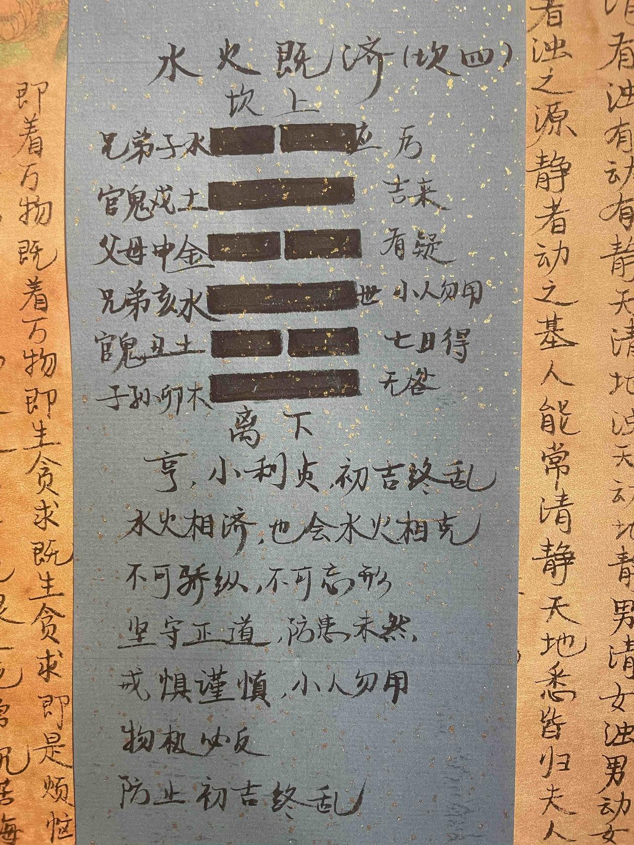 63水火既济 亨。小利贞,初吉终乱。 初九,曳其轮,濡其尾,无咎。 六二,妇丧其茀,勿逐,七日得。 九三,高宗伐鬼方,三年克之。小人勿用。 六四,濡有衣袽,终日戒。 九五,东邻杀牛,不如西邻之禴祭,实受其福。 上六,濡其首,厉。 水火既济卦,离下坎上,水在火上。水能灭火,火也能烧干水,两者之间能量合适才既济,物极必反。 如创业与守业的关系。创业成功了不要得意忘形,不可骄傲自满。要坚守正道,防患未然。不可因为成功了冲昏头脑,保持正道,谨慎小心。 不要忘记战争的残酷,创业的艰难。不要启用小人。冷静谨慎,这样才能水火既济,才不会初吉终乱。 易学智慧 国学文化 水火既济 写字是一种生活