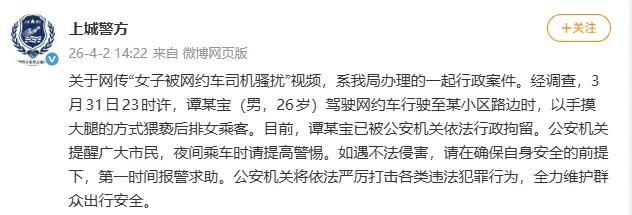 手摸后排女乘客大腿,换来行政拘留的处罚,这位杭州的网约车司机到底是咋想的? 杭州警方刚刚通报了一起网约车猥亵案,一名26岁的男司机竟然对女乘客伸出了黑手。 事情发生在3月31日晚上11点多,姑娘结束了一天行程,坐上这辆网约车准备回家。谁知道这个谭姓司机把车开到某小区路边时,竟然回头用手摸姑娘的大腿! 说实话,看到这个新闻我整个人都不好了。大半夜的,一个单身女性坐在陌生人的车里,车门一锁,真是叫天天不应叫地地不灵。这种恐惧感,可能只有女生才能真正体会。 好在姑娘果断报警了!杭州上城警方动作也快,4月2日就把这个色狼行政拘留了。通报虽然只有短短几行字,但看得出来警方态度很明确:零容忍! 不过说实话,行政拘留够吗?用手摸大腿,这已经是赤裸裸的猥亵行为了。如果不是姑娘反抗或者及时报警,后果可能更严重。 很多网友也在问:为什么不是刑事拘留?这也给所有网约车平台提了个醒,司机背景审核、车内监控、一键报警这些功能,到底落实到位没有? 最后想对所有姐妹说:深夜打车,一定要坐后排,把行程分享给亲友,手机保持电量充足。感觉不对劲立刻报警,别犹豫!安全永远是第一位的。 你觉得网约车平台还该做些什么?评论区聊聊你的看法。