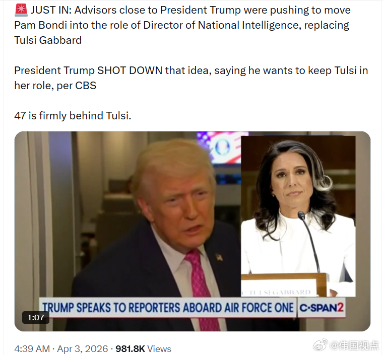 据CBS,接近总统的顾问曾推动将帕姆·邦迪调任为国家情报总监,以取代图尔西·加巴德。