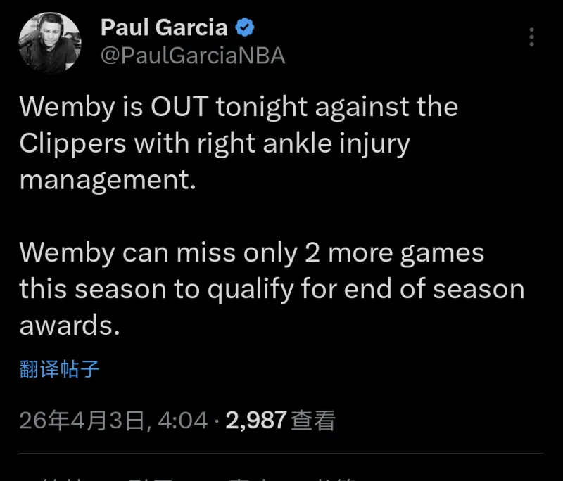 文班亚马因右脚踝伤势管理,今日对阵快船的比赛缺阵。