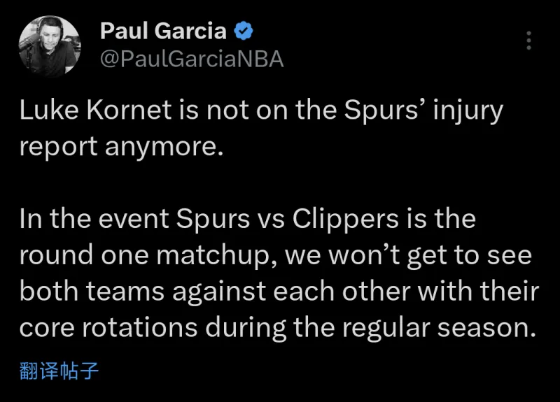 卢克·科内特已经不在马刺的伤病名单上了。