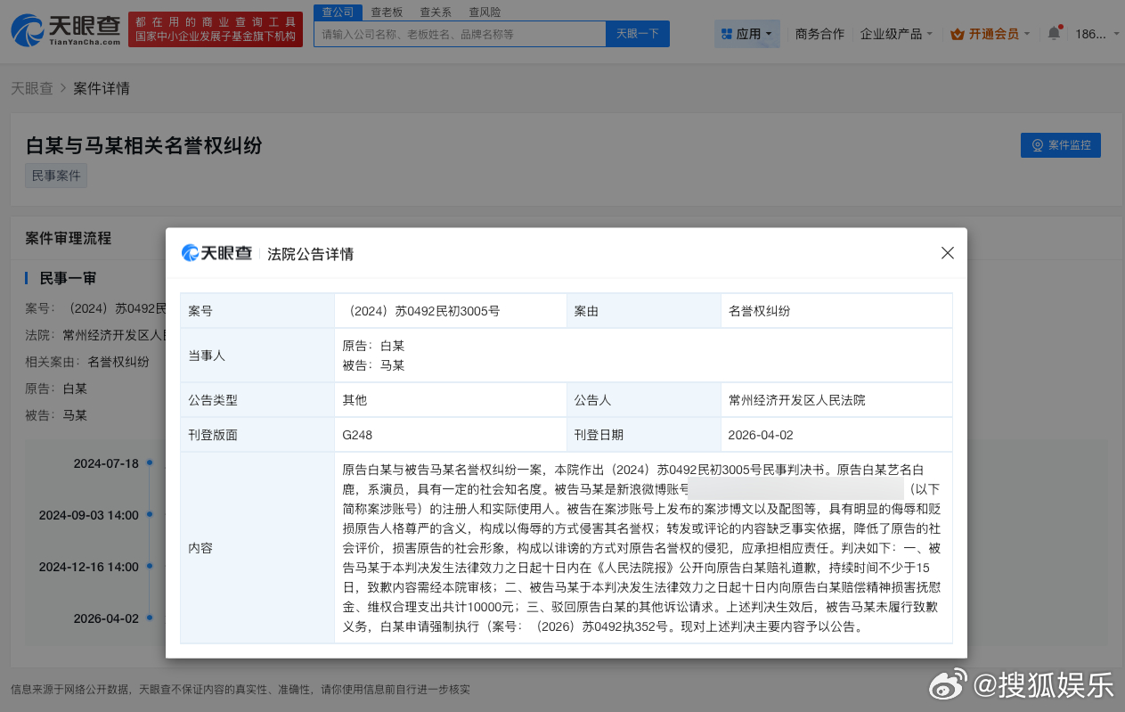 造谣白鹿黑粉被判公开道歉 天眼查天眼风险信息显示,4月2日,常州经济开发区人民法院刊登原告白梦妍(白鹿)与被告马某名誉权纠纷一案民事判决书。被告构成以侮辱、诽谤的方式侵害原告名誉权。判决马某公开向原告白梦妍赔礼道歉,赔偿精神损害抚慰金、维权合理支出共计1万元。上述判决生效后,被告马某未履行致歉义务,白鹿申请强制执行。