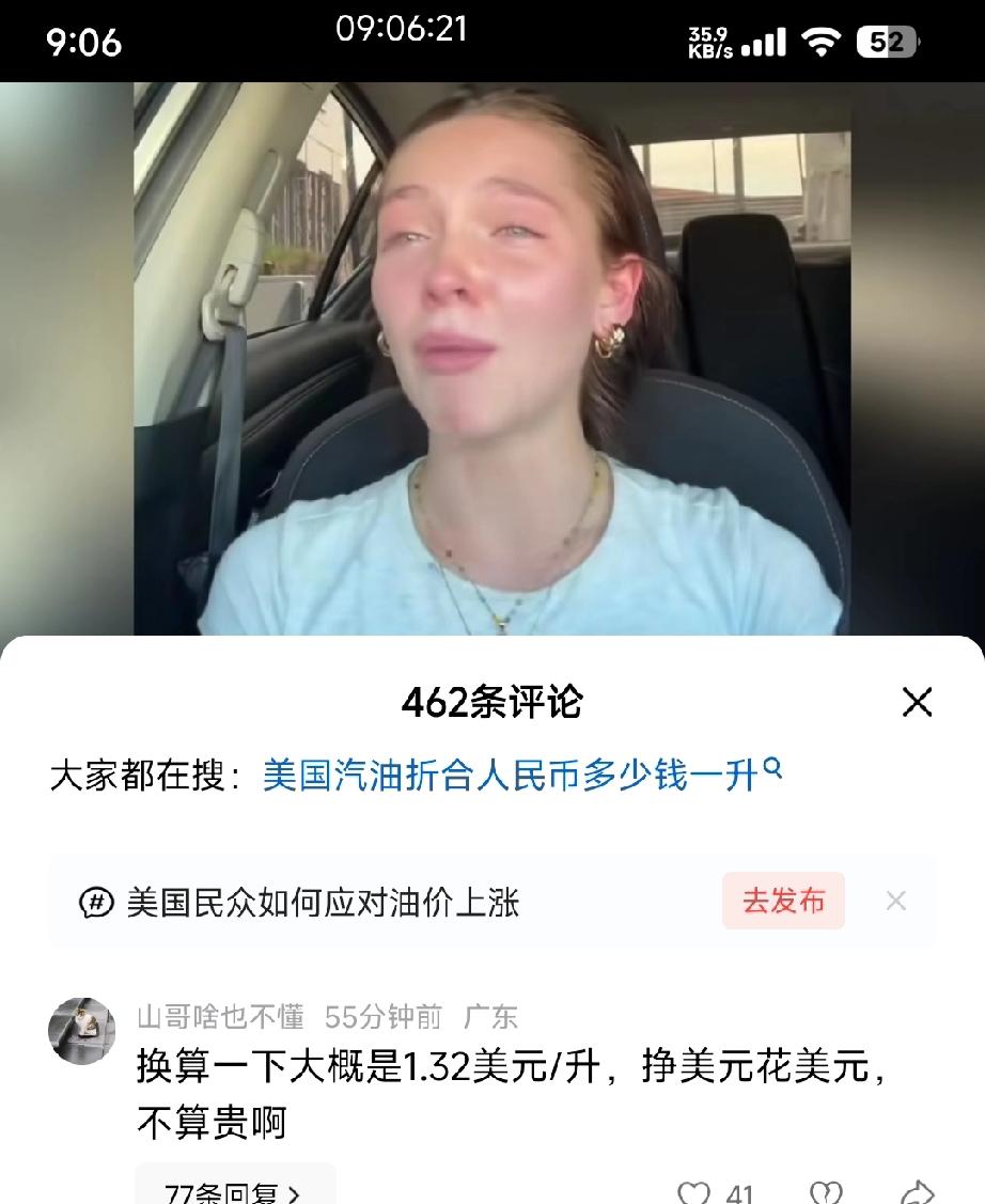 高油价让这个美国姑娘崩溃,在网络上哭诉。 美国姑娘明明很难受,而这位网友还说:换算一下大概是1.32美元/升,挣美元花美元,不算贵啊! 美国人说了算还是网友说了算? 美国人赚的钱不止要用来加油,还得用来租房子买各种保险和生活开支。 这个美国姑娘说了,没有别的交通工具,每天开车油价上涨让她压力很大,不止油价高,房租也特别贵。 物价上涨,房租贵,油价上涨,对于每天平均要开车一百公里的美国人来说,1.32美元一升已经特别贵了。 要知道美国基础交通设施落后,离不开车子。
