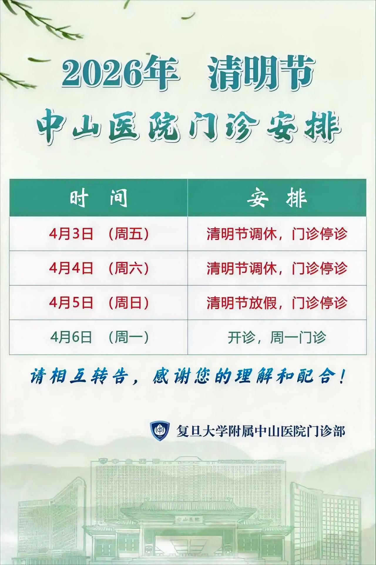 2026年清明节期间复旦大学附属中山医院门诊安排