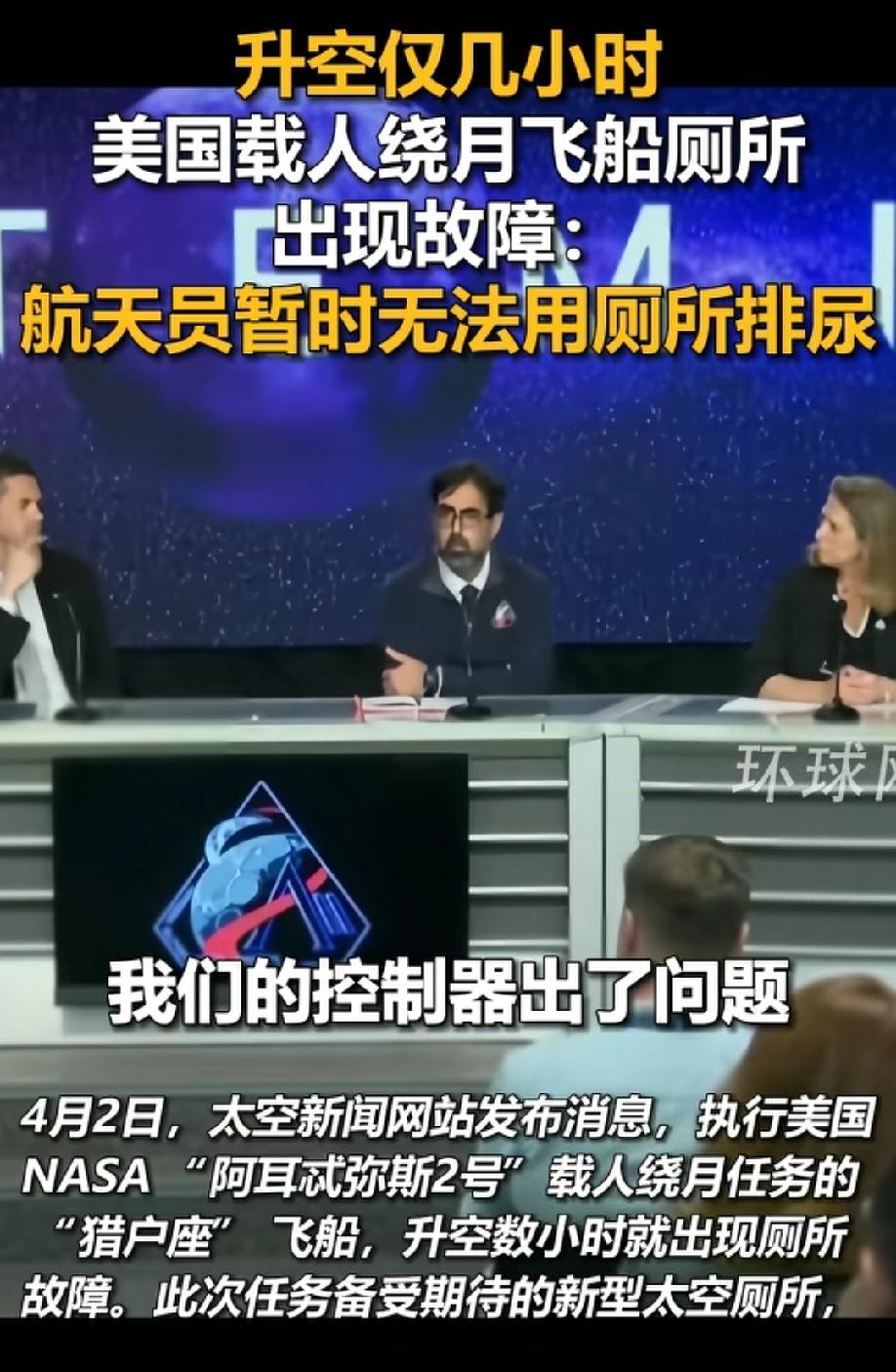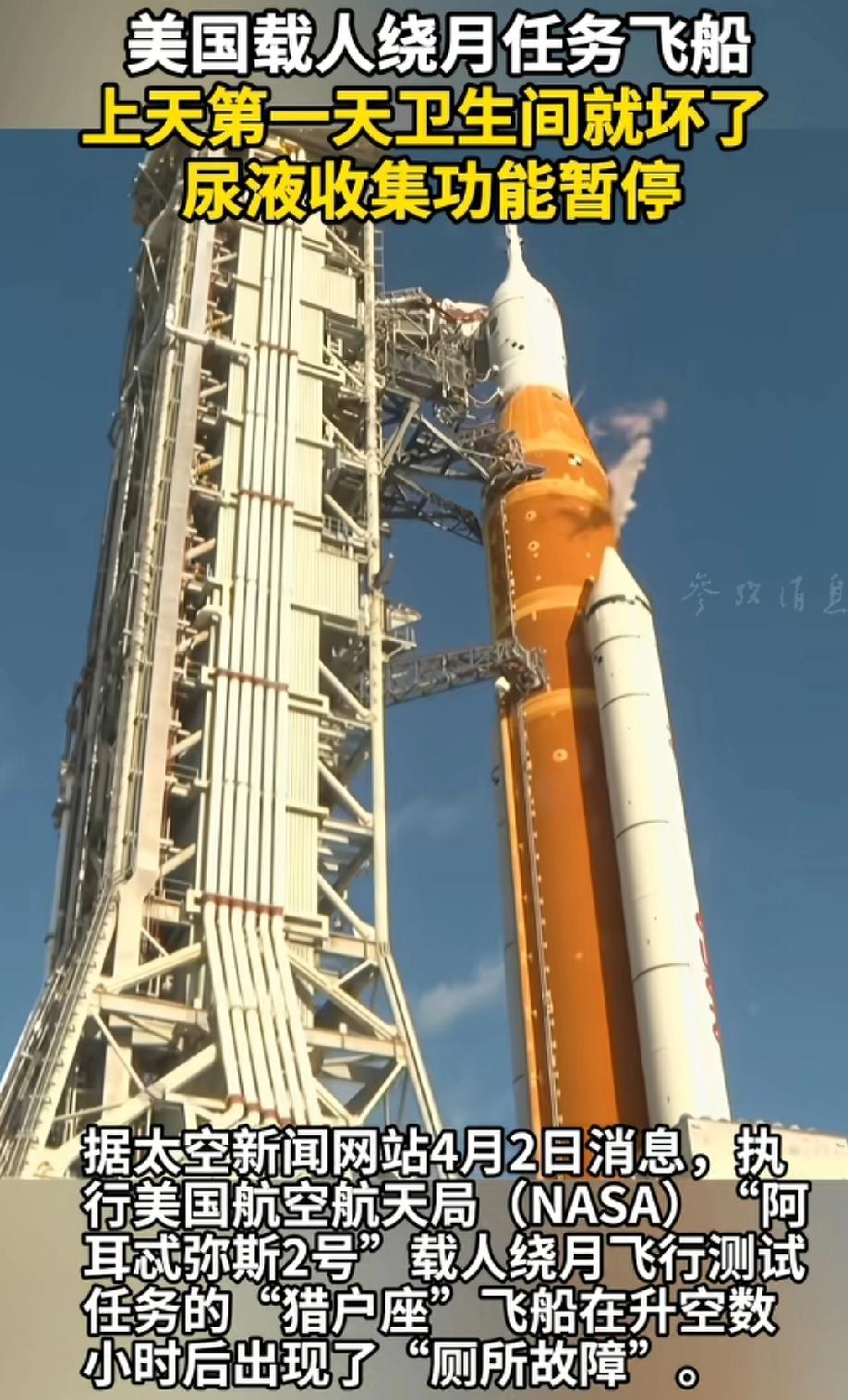 美国载人飞船绕月第一天,价值2300万美元的飞船厕所就坏了! 你没有看错,继福特号航母厕所门事件以后,天上的飞船厕所也坏了! 这事儿闹得,福特号航母上的美国大兵最起码还可以对着海面猛烈发射,天上的飞船上面四个宇航员可咋整? 结果呢? NASA给出来的答案是塑料袋! 那场面,绝逼不敢想象! 美国明知道绕月飞行是个大坑,为啥特朗普还要铁了心的往里跳? 无他,特朗普太需要一场大赢特赢来证明美国还是这个世界的霸主了! 伊朗的烂摊子,特朗普傻乎乎的跳进去了,想抽身几乎是不可能的,内塔尼亚胡不会让他走,伊朗这个被炸了一万多个目标的国家也不会让他走。 美国内部呢,民主党逮住特朗普非法开战的把柄不放,全美都在大游行,特朗普的基本盘都丢了! 内外交困之下,特朗普还能怎么办? 继续造梦呗! 于是,你明明知道绕月技术条件不行,设备有隐患,一拖再拖的发射延期,特朗普还是打算赌一把,赢了,美国继续伟大,输了,NASA背锅!