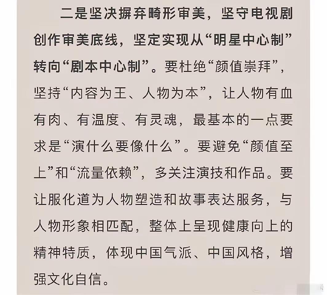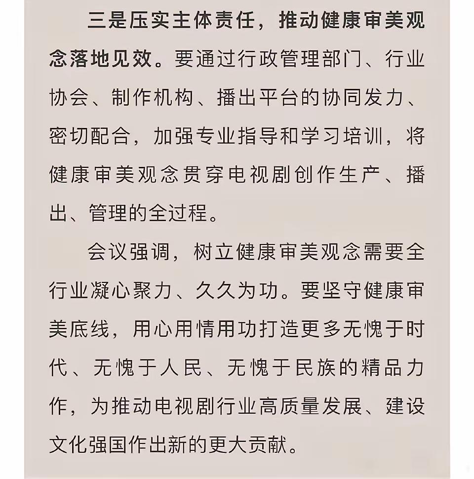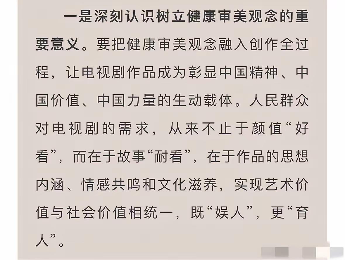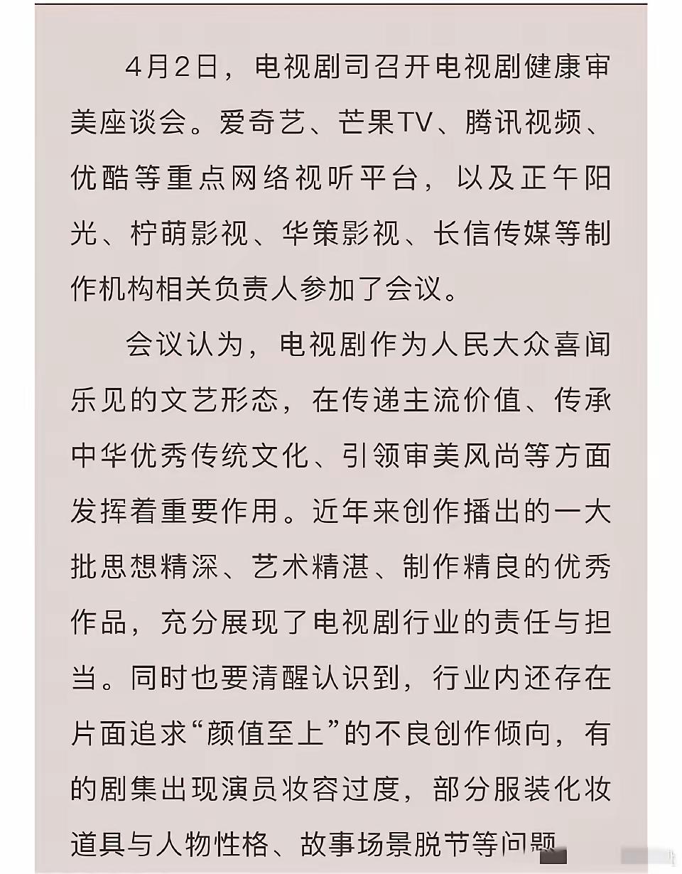 大快人心,广电总局出手了,以后粉底液将军可能看不到了。广电总局召开电视剧审美座谈会,针对妆容浮夸、脱离剧情、畸形审美等问题进行讨论。会议没有针对某一剧集,但明眼人心里都清楚在讲哪部剧。会议强调演员要和角色有适配度,剧组要坚守文化自信,鼓励现实题材创作。 张凌赫会不会成为最后一位粉底液将军,不得而知。但这次会议向内娱传递了一个信息,娱乐圈不光要“娱人”,更要有“育人”的艺术价值观。