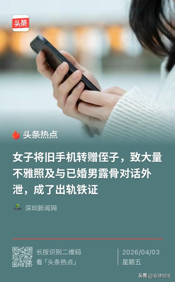 台湾一女子换了新手机后,好心将旧手机赠给侄子,结果因未退出、清理云端相册,导致自己与情人之间的大量不雅照片及露骨聊天内容外泄。事后,更是被情人妻子当作证据告上法庭。女子委屈不已,认为自己侄子没有经过自己的同意便查看自己的相册侵犯了自己的隐私权,法院审理后,认为女子侄子的行为不构成侵权,同时认为女子的行为侵犯了情人妻子的配偶权,裁定女子赔偿赔偿情人妻子8万余元。 据悉,台湾有位林女士(化名),前段时间换了部新手机。 林女士想着旧手机还好好的,扔了怪可惜,又想着自己的侄子刚好缺一部手机用,就好心把旧手机转赠给了自己的侄子。 林女士的侄子拿到林女士的旧手机后,随手点开相册看了看,结果一翻,发现全是林女士的私密照片,还有不少林女士与情人之间的露骨的聊天对话。 原来,林女士的旧手机一直开着云端同步功能,林女士给侄子旧手机时,没有删除里面的内容,也忘记退出账号。 事后,林女士的侄子并没有将此事告诉给林女士。 而没过多久,这些内容就传了出去,最后还落到了林女士情人妻子陈女士(化名)手里。 陈女士看到这些铁证,又气又委屈,遂以侵犯配偶权为由,一纸诉状将林女士告上了法庭,要求林女子赔偿自己的精神损失。 拿到法院传票的那一刻,林女士才后知后觉。 法庭上,面对陈女士拿出的“铁证”,林女士觉得很委屈,辩称,自己的侄子未经自己同意就翻看手机相册,侵犯了自己的隐私权,意指陈女士的证据的来源不合法,属于非法证据,不能采信。 不过法院审理后认为,林女士是自愿把旧手机送给侄子的,交付之前,既没有删除里面的私密照片和对话,也没有给手机设置密码,理应预见,侄子使用手机时,有可能会看到这些内容。难以认定林女士的侄子系故意侵犯林女士的隐私。 认为林女士与陈女士丈夫的互动,已经明显超出了普通朋友的社交分寸,严重破坏了陈女士的配偶权。 最终结合林女士和陈女士双方的身份、经济能力等实际情况,裁定林女士限期赔偿陈女士40万元新台币(约合人民币8.6万元)。 该事一时间引起热议,网友纷纷表态。 有网友表示,这个侄子做事也太不地道了! 但也有网友表示,这是不赖侄子,要怪还要怪女子自己太粗心! 需要特别说明的是,上述判决是基于台湾地区的法律作出的,若类似事件发生在大陆,结果可能就大不一样了! 一方面来说,《民法典》第1165条规定,行为人因过错侵害他人民事权益造成损害的,应当承担侵权责任。 应当注意的是,这里的过错既包括故意,也包括过失。 换句话说,过失行为也可导致侵权。 具体到本案也就是说,即便林女士的侄子不是故意看到林女士的私密照片、聊天内容,但自己看也就罢了,没有保管好还导致这些内容传播出现同样也可认定为侵犯了林女士的隐私。 另一方面来说,《民法典》第1043条明确规定,夫妻应当互相忠实,互相尊重,互相关爱,维护平等、和睦、文明的婚姻家庭关系。 大陆法律中也有配偶权! 不过违反忠诚义务所引发的法律后果主要体现为婚姻关系内部的法律评价,如是否构成法定的离婚理由,是否为过错方,是否在夫妻共同财产分割时予以照顾等。 婚姻中的无过错方一般是不能向第三方主张侵权赔偿的,除非有明确的证据证明第三方存在引诱、唆使一方违反忠诚义务,或者挑衅、侮辱另一方的行为,且该行为严重侵害了自身的具体人格权益或财产权益。 这事您怎么看?欢迎在评论区留言,与大家一起交流您的看法! ------ 关注@安律说法 案例中看人生百态,法律中寻破局之法!