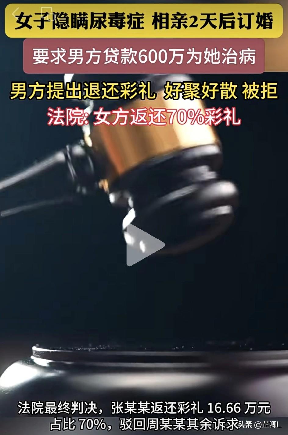 河南女子隐瞒尿毒症,相亲2天就订婚,被发现后,逼男方贷600万治病被拒直接拉黑!法院判决来了! 真是离了大谱!河南这起相亲订婚的闹剧,看完让人血压都得飙升! 2025年1月5日,河南一男子经媒人介绍相亲,认识女子才短短2天,于7日就匆匆订了婚。 男子按照习俗,给了女方18万8彩礼、三金再加5万车款,前前后后一共花了23万8。 订婚后俩人办了婚礼住在一起,可结婚证还没来得及去领,男子就得知了一个惊天消息:女方竟然早就患有尿毒症,还有一大堆糖尿病并发症! 更过分的还在后面,被男方发现了自己的病症,女方没有心虚,而是直接开口,要求男子去贷款600万给自己治病! 认识两天就订婚,满打满算统共才相识三个月,哪来的“深厚”感情到贷款治重病,男子不同意,想想跟女方协商把彩礼退了,好聚好散。 万万没想到,女方直接放话:不可能! 后来女方生病昏迷住院,出院之后,直接把男子微信拒收、拉黑,彻底玩消失,一分钱都不想退。 男子无奈只能起诉到法院,最终法院判决:女方返还70%彩礼,也就是166600元,其他诉求驳回。 这事一出网友直接吵翻了: “隐瞒重大疾病订婚,纯属骗婚,就该全额退彩礼!” “结婚不领证,女方这是知道一旦暴露,结婚证领了也没用,隐瞒重大病史,可以撤销的啊!” “600万治病简直离谱,谁能拿得出这么多钱,摆明了坑人!” “法院判返还70%已经很合理了,毕竟俩人也共同生活过一段时间。” 相亲闪婚本来就风险拉满,婚前隐瞒这么严重的病史,被发现了还狮子大开口要天价治疗费,被拒就拉黑跑路,这操作真的太让人无语了! 结婚前一定要先领证,领证前一定要先婚检!这对男女双方来讲,是件双赢的事情,对家庭和未来的婚姻生活负责,有百利而无一害! 任何拒绝领证、婚检的行为,都隐藏着不能被人知道的猫腻或者陷阱,敬而远之方为上策! 大家觉得这判决合理吗?相亲结婚真的得擦亮眼睛,闪婚要谨慎! 素材来源:直播河南,侵联删!