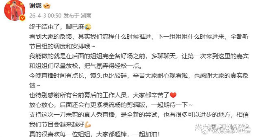 谢娜回应乘风直播节奏慢4月3日凌晨,谢娜发文回应,称流程全都听节目组的调度和安排,之后还会有更紧凑流畅的剪辑版。在直播时她也表示弹幕不要催促,需要听导演安排。