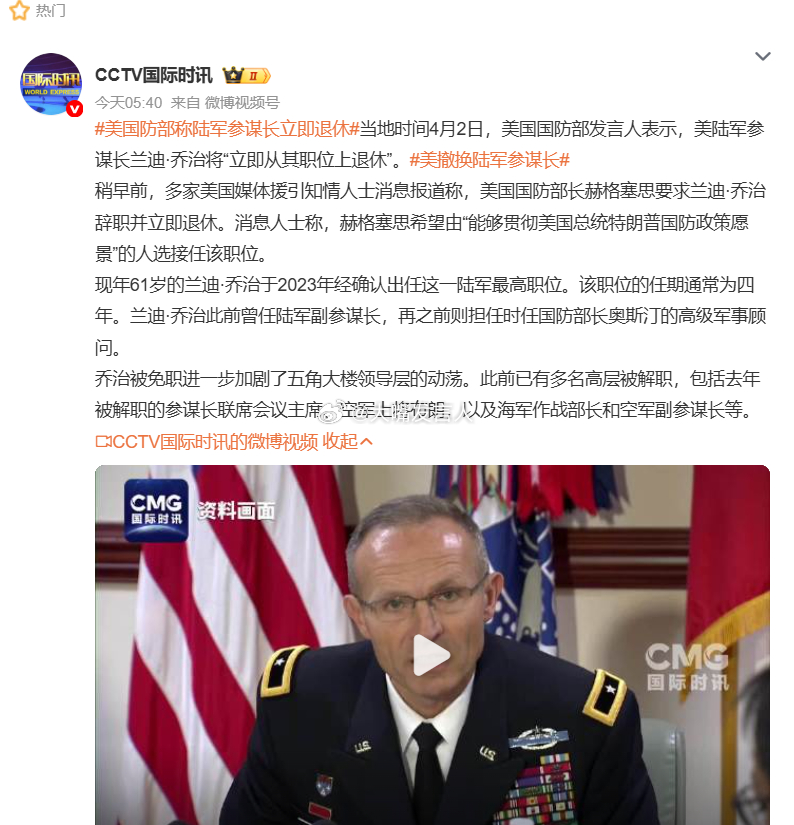 美国防部称陆军参谋长立即退休 还是不懂职场生存之道呀“效忠党国,首先要效忠长官”,保密局天津站机要室主任余则成,向您分享职场升职之道 另外,为什么排长赫格塞思能升任战争部长(图2),你看看人家哪怕被长官川宝送了一双大两码的皮鞋,赫格塞思二话不说,照顾穿着学吧,这都是本事美撤换陆军参谋长,美防长要求陆军参谋长辞职并立即退休,伊朗称霍尔木兹海峡不会回到战前状态,热点观点