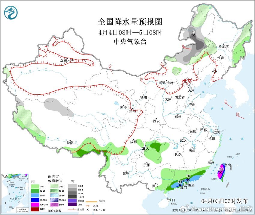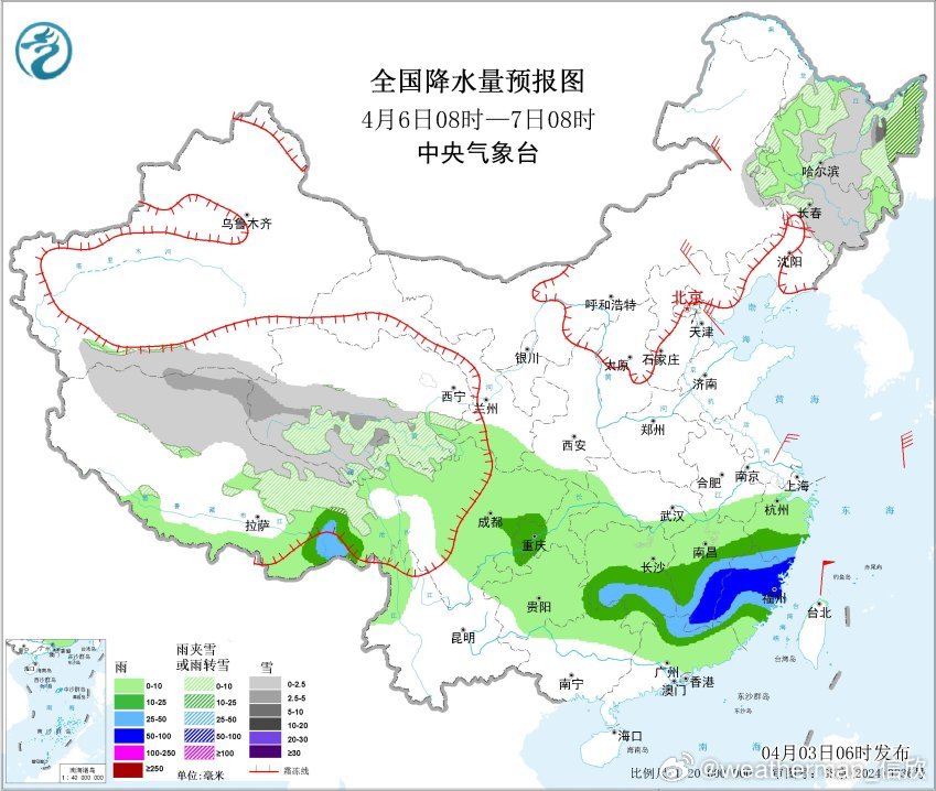 明天低空偏北风南下,江南降雨暂时结束。广东和台湾还有强降雨。4月5-6日暖湿气流再次加强,推动南方降雨区再次向北扩展。此外,内蒙古东部和吉林黑龙江一带,频繁受到冷槽/冷涡影响,还有降水,而且因为气温较低,处于雨雪临界,降水相态复杂,甚至可能出现雨雪不断切换的情况。