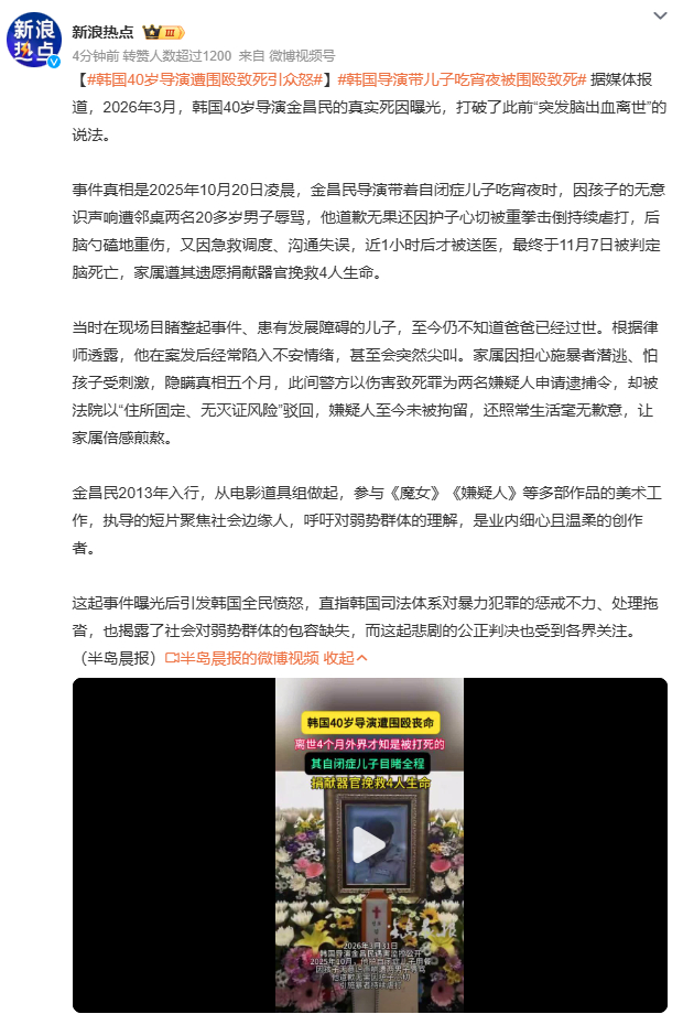 韩国40岁导演遭围殴致死引众怒韩国导演金昌民事件是多重社会问题的集中爆发:施暴者极端冷血、对弱势群体缺乏包容;急救体系低效、错失黄金时间;司法处置宽松、正义缺位。唯有严惩凶手、整改急救与司法漏洞,才能告慰逝者,修复社会安全感。