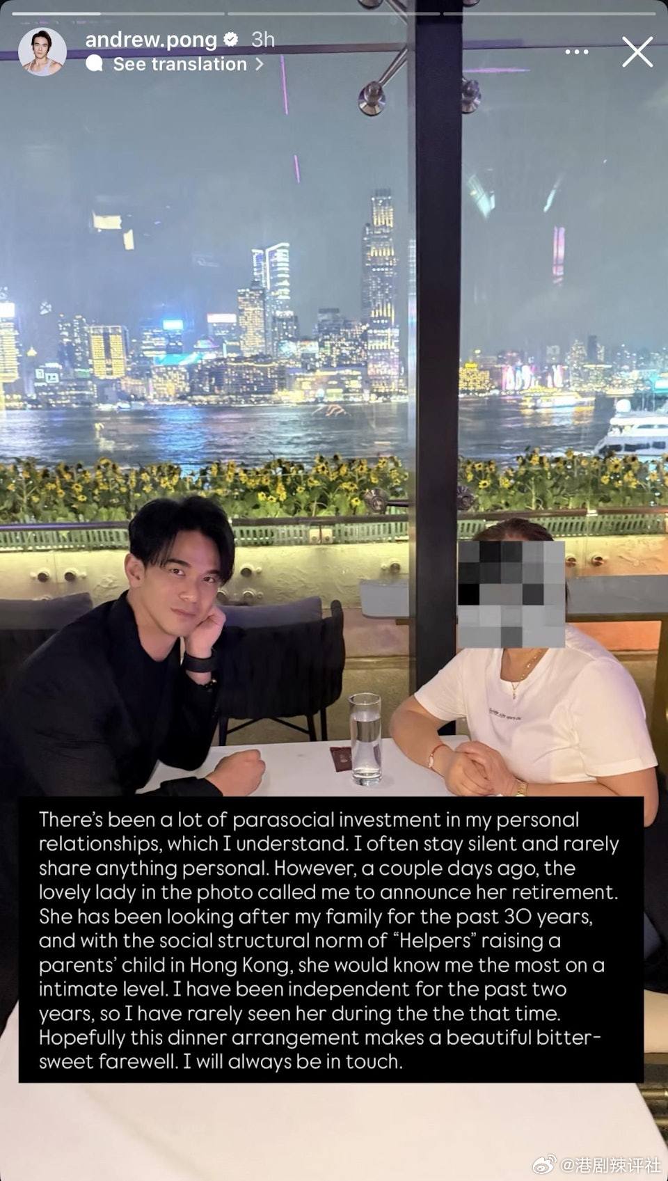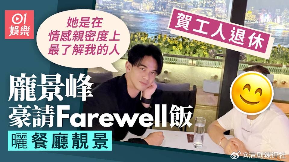 龐景峰近日在Instagram限時動態分享一張在餐廳食飯的照片,面向靚景,景觀十分不錯。龐景峰透露工人姐姐照顧了家人30年,幫手湊大小朋友,是龐景峰最親密也最了解他的之一。龐景峰指至今獨立生活兩年,甚少見到她,希望這餐飯能作一個美麗的道別,他說:「Hopefully this dinner arrangement makes a beautiful bitter sweet farewell.」
