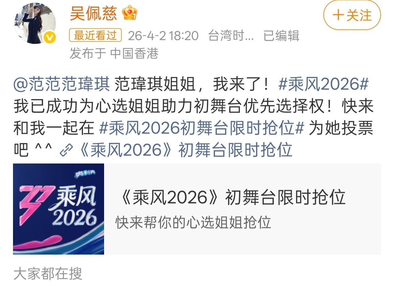 吴佩慈给范玮琪投票吴佩慈力挺范玮琪谁懂啊!曾经的七仙女售后居然还在发糖🍬!淡出公众视野许久的吴佩慈,默默上线只为范玮琪投票应援,没有高调宣传也没有刻意造势,只是用最直接的方式支持闺蜜,这是什么神仙闺蜜情啊,慕了慕了!这份不张扬却始终坚定的陪伴太好哭,果然岁月不败真友谊~乘风2026