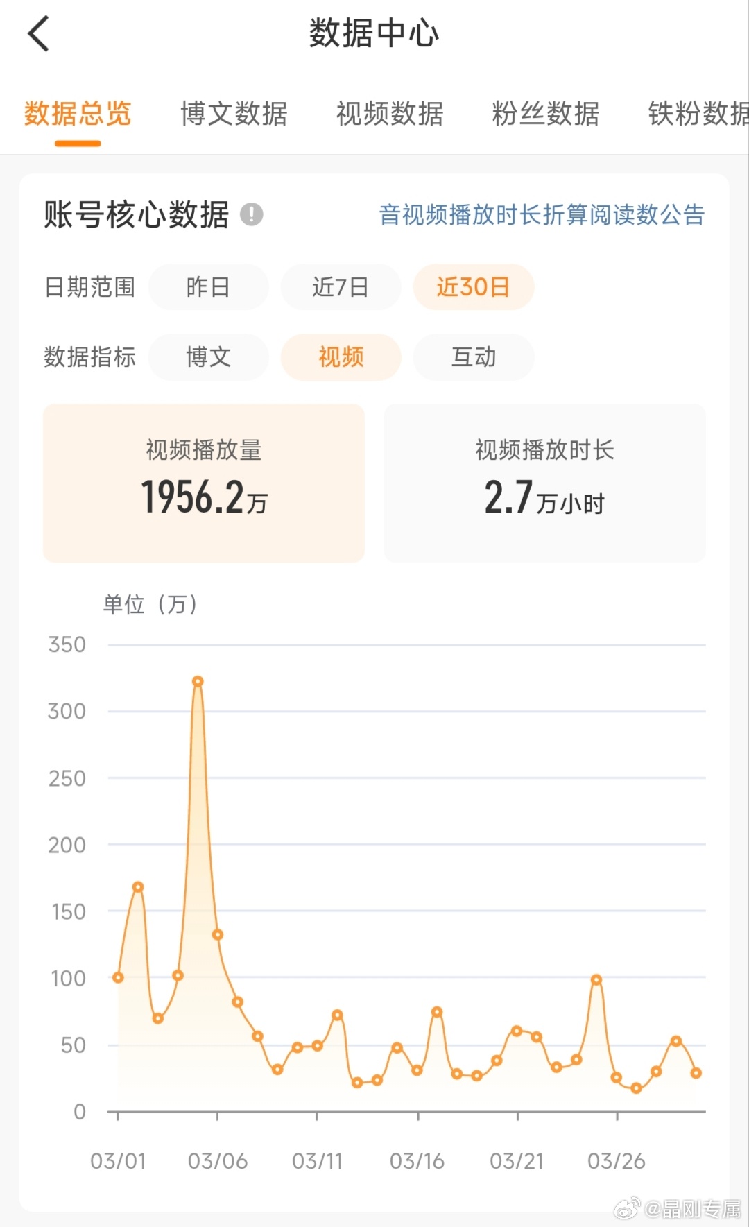 3月微博总结:发博665条,总阅读2.6亿,视频播放1956万,时长2.7万小时。