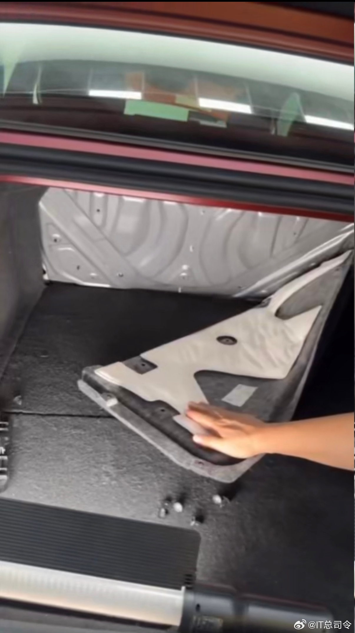 前舱直接拉满5横6纵2竖共13根梁,前后车门、车尾、二排座椅背后全是扎实钢梁,连车门都给上了豪华车才常见的双防撞梁。更牛的是后排,掀开软包是超粗的后尾横梁,座椅背后是一整块高强度钢板,直接和横梁刚性连接,焊点规整到离谱。