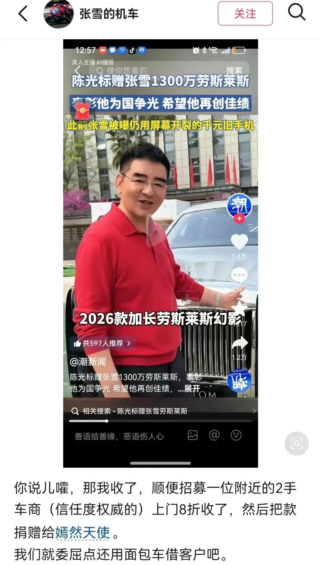 张雪太耿直,让全网都在等陈光标送车,“中国首善”这把玩脱了,已经骑虎难下。张雪机车一战封神后,各路牛鬼蛇神都冲出来,有的送上鲜花和祝福,有的想趁热蹭热度刷存在感。退出江湖许久的“中国首善”陈光标,这次也没忍住,向来视金钱如粪土的陈首善,一出手就是王炸,直接发视频豪华张雪,豪言想将自己刚买的中国唯一一辆劳斯莱斯幻影送给张雪,作为张雪公司接待用车,价值1300万。如此豪横的礼物岂能说送就送,还是一个此前没有任何交集的陌生人,换做旁人都是婉言谢绝,或者一笑置之不当回事,即便对方可能是真的想送。 张雪偏偏不按常理出牌,这个一心只关心摩托车的偏执狂,耿直的不加任何掩饰。张雪直接回应陈首善,“你说儿豁,那我收了,顺便招募一位附近的二手车商上门8折收了,卖车钱全捐给嫣然天使,我们委屈点还用面包车接客户。”意思就是你真想送,那我就真要,不过车卖掉,钱捐出去,自己不留。张雪还用上了川渝地区的方言“儿豁”,意思是骗你是儿子。等于是替陈首善把话坐实了,要送就真送,别扯犊子,事情到这一步把首善整不会了。 陈首善显然没料到张雪会这么耿直,1300万的车我可能就说说而已,你还真敢要。紧接着首善一个发出又删掉的澄清,暴露了自己的真实一面,他说车只是赠个人使用,想卖掉捐赠,这是误会了我的初心。言外之意就是车子所有权还是我的,只是让你用不能卖。有好事网友立马喊话张雪:标哥这车应该不会过户,给你用。张雪的回复更直白,“那就对他竖中指”。 事已至此陈首善是彻底骑虎难下了,自己喊出来的话做出来的承诺,总不能再收回去吧。于是陈首善改口称,卖车转赠也是好事,我支持。具体我们私下对接就行,车的事就这么定了。如今这车送自己亏大发了,不送也是问题,若是跟之前那样被人说是“诈捐”,那首善的脸往哪搁?所以这次失控的送车事件,陈光标的热度肯定是吃的够够了,但想要事件顺利平息下去,还得张雪配合才行。所以明面上说不通,就只能私底下协商了。 最后会以什么形式收尾,目前还不得而知。不过陈光标这次也是被张雪上了一课,不能否认陈首善之前做过不少善事是真的,可总热衷于博眼球搞噱头更是不假。少有的一次翻车,多少也会让首善在今后的行事中,多少收敛一点给自己留条后路。