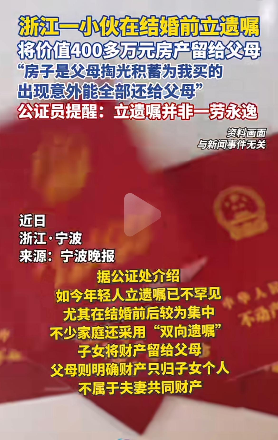 浙江29岁小伙结婚前立遗嘱,把400多万房产留给父母,这事儿一报道就引发热议。小伙的房子是父母等长辈倾尽家产买的,他怕婚后意外没孩子,财产纷争让父母没保障。未婚妻开始被吓一跳,了解后也支持。 现在年轻人婚前立遗嘱的越来越多。不立遗嘱,遗产按法律分配,配偶、父母、孩子都有份;立了遗嘱,就按遗嘱来。比如父母没立遗嘱,财产子女和其配偶都有权继承。这小伙的做法很明智,既保护了父母的心血,也给未来上了保险,值得理解和支持。