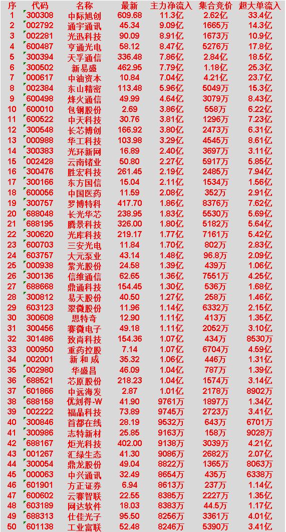4月3日开盘45分钟,主力资金“买入的 ”的50名单一览! 中际旭创:最新价 609.68 元,主力净流入 11.3 亿元 通宇通讯:最新价 45.34 元,主力净流入 9.09 亿元 光迅科技:最新价 90.09 元,主力净流入 8.91 亿元 亨通光电:最新价 58.12 元,主力净流入 8.47 亿元 天孚通信:最新价 336.48 元,主力净流入 7.86 亿元