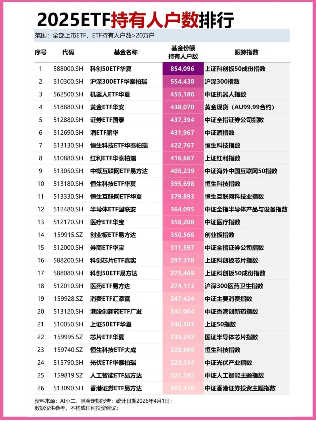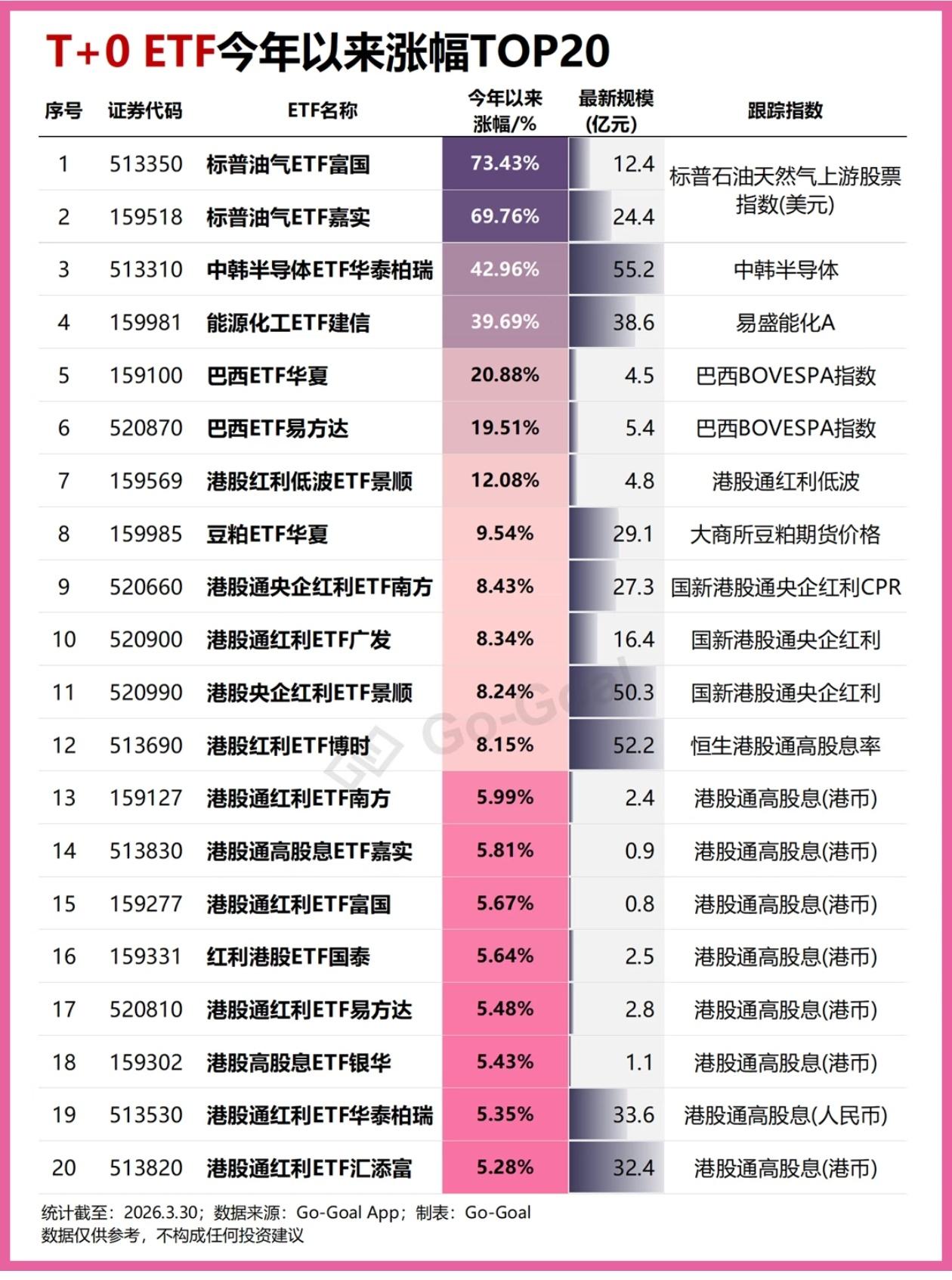 散户必看!2026年A股ETF最全财富地图,跟着数据抄作业,稳稳赚钱不踩坑! 巴菲特说过:“投资的本质,是投那些简单、易懂、能长期赚钱的资产。” 很多人炒股总亏钱,不是因为没选对赛道,而是因为太复杂: 挑个股、盯财报、追热点、频繁交易,最后越炒越亏。 而ETF,就是给普通人准备的“懒人神器”:不用挑个股、不用研究财报,一键打包整个赛道,分散风险、流动性好,躺着就能赚赛道红利! 今天把近期最全的ETF数据、投资逻辑、抄作业指南,全给你整理好了! 从T+0、红利、电力、医药,到国家队重仓、散户人气榜,一张表看懂2026年A股的财富密码! 一、先看趋势:今年最猛的ETF,全在这了! 1. T+0 ETF涨幅榜:最高狂涨73%! 油气ETF霸榜第一,标普油气ETF富国今年以来涨73.43%! 中韩半导体、能源化工全线大涨,港股红利低波稳中有进。 T+0 ETF,当天买当天卖,灵活度拉满,是普通人上车全球赛道的最优解! 2. 电力ETF黑马榜:近1个月狂涨12%! 绿色电力ETF霸榜,最高涨12.03%! 传统电力、绿色电力、电网设备全线爆发,电力是刚需,4万亿电网大建设+新能源转型,是今年的黄金赛道! 3. 红利ETF规模榜:312亿资金扎堆,稳赚分红! 红利低波ETF华泰柏瑞规模312.77亿,港股红利ETF近一年涨超22%! 高股息+低波动,分红拿到手软,下跌更抗跌,是普通人养老、做底仓的最优解! 二、看懂赛道:不同需求,不同选择! 1. 求稳:红利+宽基,稳稳幸福 - 红利低波ETF:312亿规模,波动小、分红高,做底仓首选; - 沪深300/科创50ETF:国家队重仓,一键打包A股龙头,买它就是买中国经济的未来; - 港股红利ETF:高分红+低波动,今年涨幅超20%,稳中有赚。 2. 求赚:科技+周期,弹性拉满 - AI/半导体/机器人ETF:黄仁勋Token工厂经济学核心赛道,国产替代+AI算力双驱动; - 油气/有色/能源化工ETF:周期主线,油价上涨+新能源刚需,弹性爆炸; - 电网设备/光伏ETF:4万亿电网大建设+碳中和,直接吃满产业红利。 3. 避险:黄金+医药,抗跌抗风险 - 黄金ETF:乱世买黄金,全球通胀、地缘冲突,永远抗跌; - 恒生生物科技ETF:一键打包港股创新药龙头,信达生物、药明生物全在里面,是医药赛道的黄金机会。 三、国家队重仓:跟着机构抄作业,不踩坑! 中央汇金、汇金资产四大国家队,拿着真金白银狂买ETF! - 宽基为王:沪深300、上证50、科创50,是国家队的绝对底仓; - 科技成长:创业板、半导体、5G,被国家队大幅加仓; - 行业主题:医药、酒、军工、有色,全是长坡厚雪的优质资产。 查理·芒格说:“投资要找简单、易懂、能长期赚钱的生意。” 国家队持仓的这些ETF,就是给普通人准备的“财富地图”! 四、普通人投资铁律:记住这3点,稳稳赚钱! 1. 不追高,只定投:热门赛道波动大,用定投拉平成本,长期持有; 2. 不一把梭哈,组合配置:宽基做底仓,行业做进攻,红利做防守; 3. 不频繁交易,长期持有:ETF是长线投资,拿3-5年,比追热点靠谱100倍。 五、写在最后:2026,ETF就是普通人的最优解! 巴菲特说:“人生就像滚雪球,关键是发现很湿的雪和很长的坡。” 2026年,想在A股稳稳赚钱,不用追热点、不用炒妖股,盯住这些ETF,长期持有,不折腾,你就已经赢过了90%追涨杀跌的散户! 这篇干货,建议点赞+收藏,存下这份ETF财富地图,慢慢布局,稳稳变富! 你最看好哪个赛道?评论区聊聊! ⚠️ 风险提示: 本文仅为ETF数据科普与投资逻辑分享,不构成任何投资建议。ETF过往业绩不代表未来表现,投资有风险,入市需谨慎,请结合自身风险承受能力理性投资。 ETF 投资 理财 A股 红利ETF 电力ETF 国家队持仓