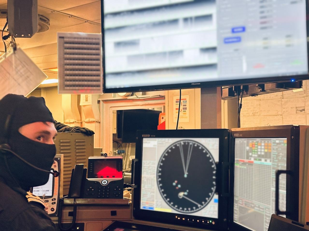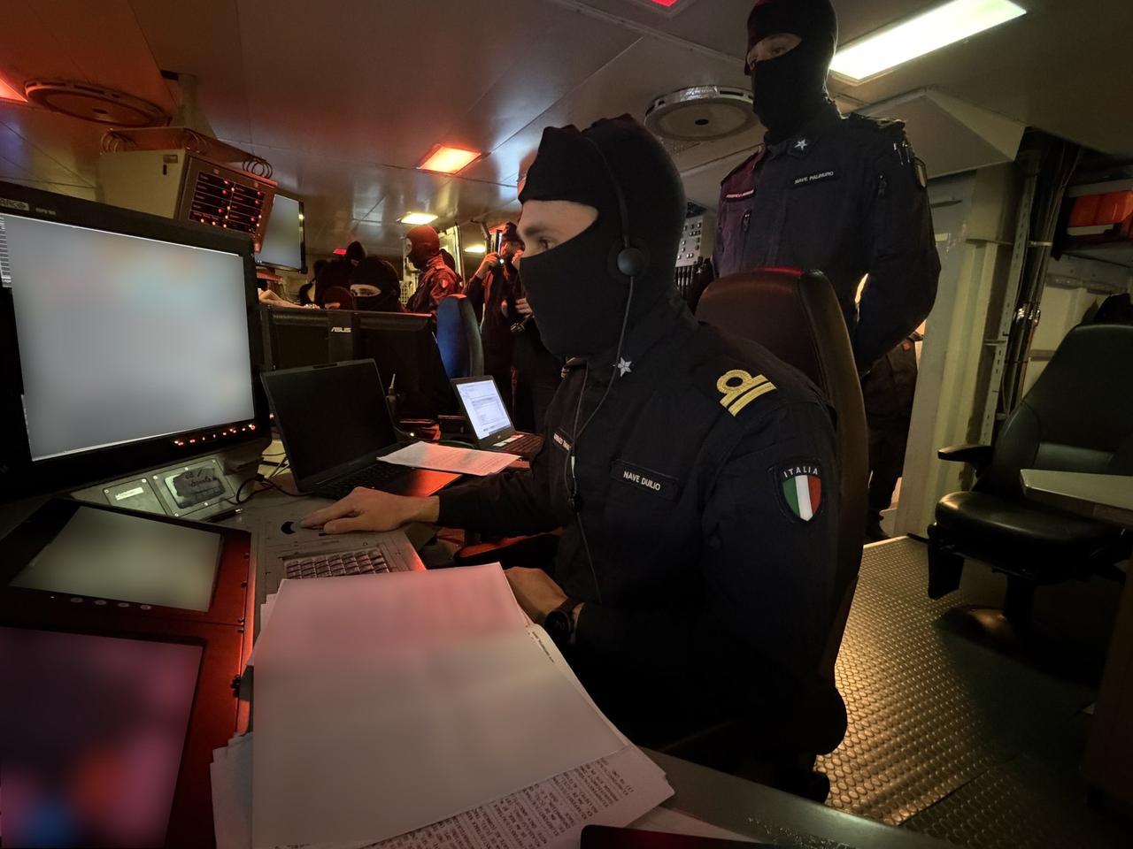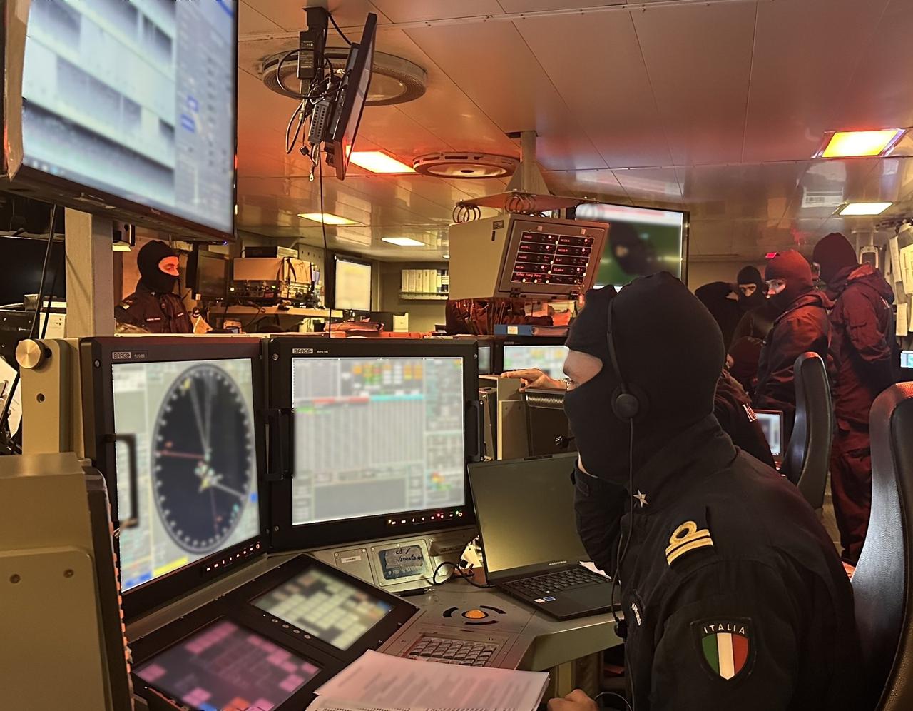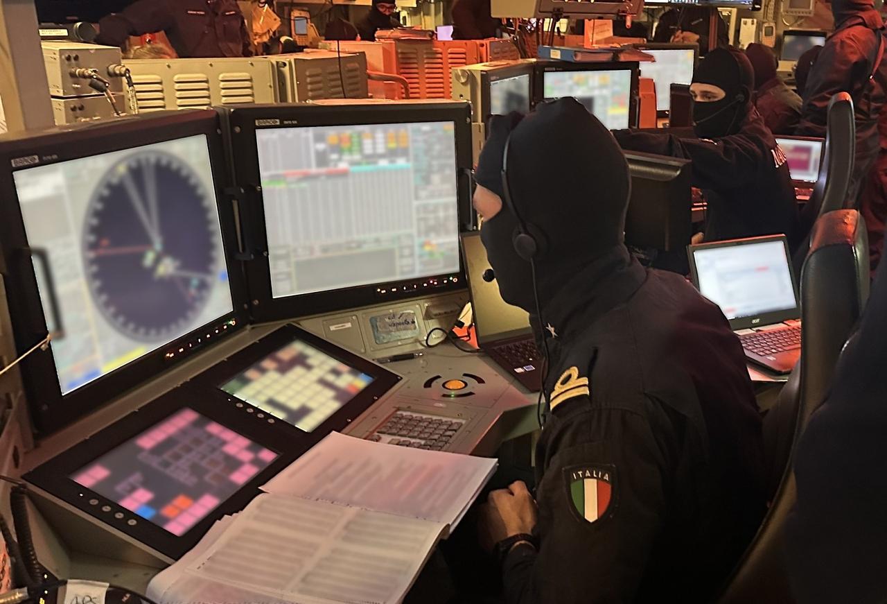 意大利导弹驱逐舰“CaioDuilio”(“卡约·杜里奥”号)给航空母舰Cavour(加富尔号)护航时,战斗作战中心(COC)通过模拟冲突进行防空训练画面。 模拟场景中,两架配备反舰导弹的飞机攻击该舰艇,该舰上的反导弹防御系统迅速作出反应。