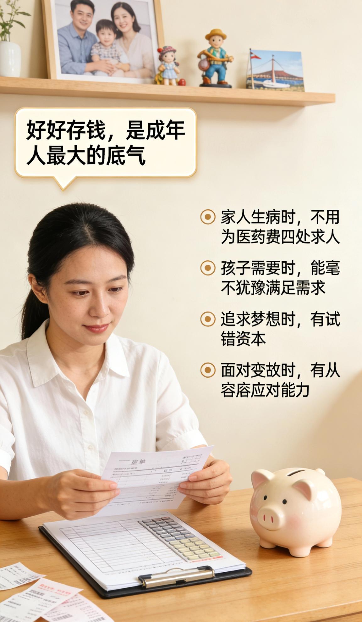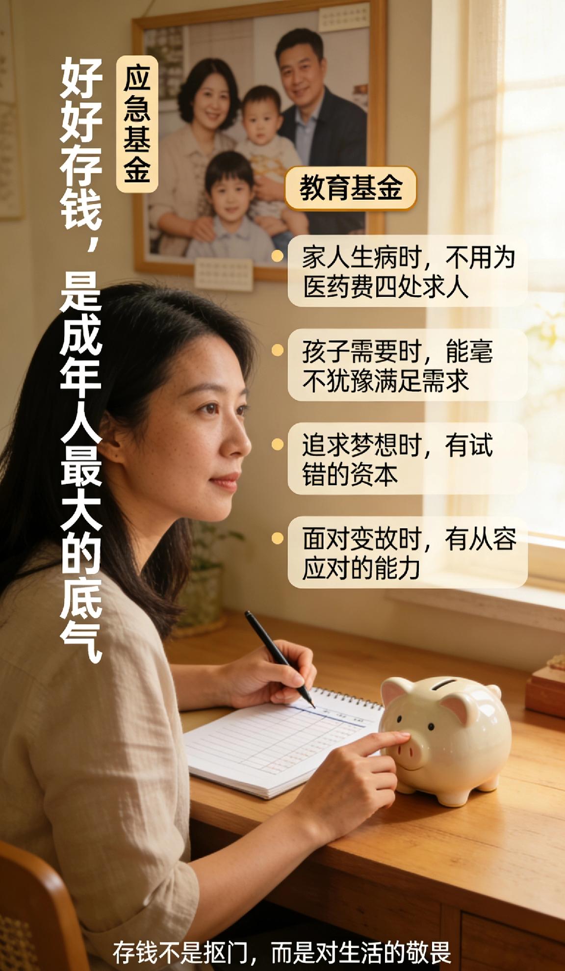 好好存钱,是成年人最大的底气 人到一定年纪才懂,手里有存款,心里才有底气,生活才有安全感。年轻的时候总觉得谈钱太俗,花钱大手大脚,月光族也无所谓,可真正遇到急事才知道,钱是对抗生活风雨最坚实的铠甲。 家人生病时,不用为医药费四处求人;孩子需要时,能毫不犹豫满足他们的需求;自己想追求梦想时,有试错的资本;面对生活的变故时,有从容应对的能力。生活从来不是风花雪月,而是柴米油盐的现实,没有钱,很多温柔和梦想都无从谈起。 存钱不是抠门,而是对生活的敬畏,对家人的负责。不用追求一夜暴富,每个月存一点,戒掉不必要的冲动消费,拒绝无效开销,慢慢积攒,手里的存款会成为你最踏实的依靠。好好存钱,就是给自己和家人一份安稳,这才是成年人最该做的事。 存钱 成年人的底气