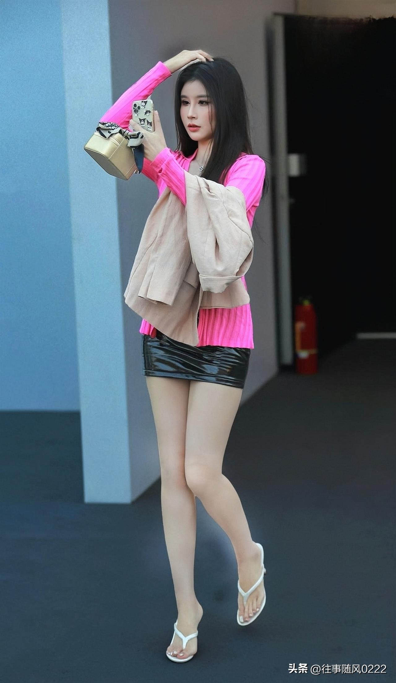 女生穿搭如何又飒又美?街拍辣妹对镜自拍,玫红开衫搭亮皮短裙,又甜又飒
