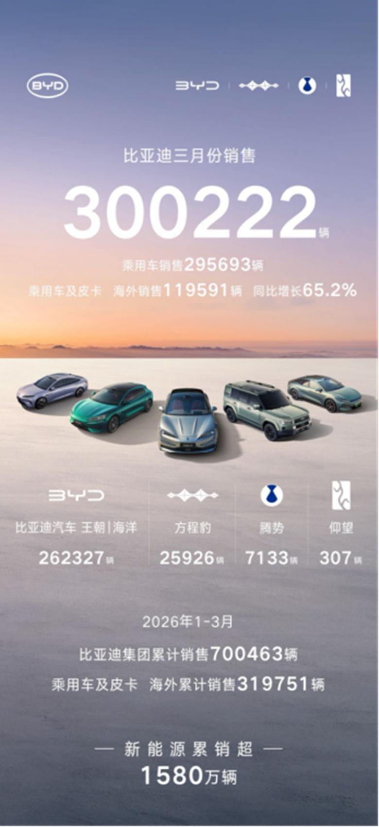 4 月 1 日比亚迪公布 3 月销量成绩单,单月总销量突破 30 万辆,达 300222 辆,拿下中国车企销量冠军,同时连续 58 个月蝉联中国新能源汽车销冠,一季度累计销量超 70 万辆。品牌矩阵全面开花,方程豹销量同比大涨 222%,各品牌覆盖全场景用车需求;海外市场表现亮眼,3 月出口近 12 万辆,同比激增 65.2%,一季度海外累计销量超 31 万辆。同时第二代刀片电池、全域闪充技术、天神之眼智驾系统接连落地,技术与销量双向领跑。【来自懂车帝车友圈】