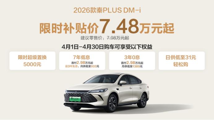 国民冠军家轿放福利了!4 月全月,比亚迪秦 PLUS 限时开启超级置换季,置换补贴至高 5000 元,补贴后价格仅 7.48 万起,同步推出 3 年 0 息、7 年低息金融方案,首付 2.98 万就能轻松入手。新车 2.79L 超低油耗、2110km 超长续航,彻底告别里程焦虑与油价烦恼,智能配置拉满,家用通勤全能适配。【来自懂车帝车友圈】